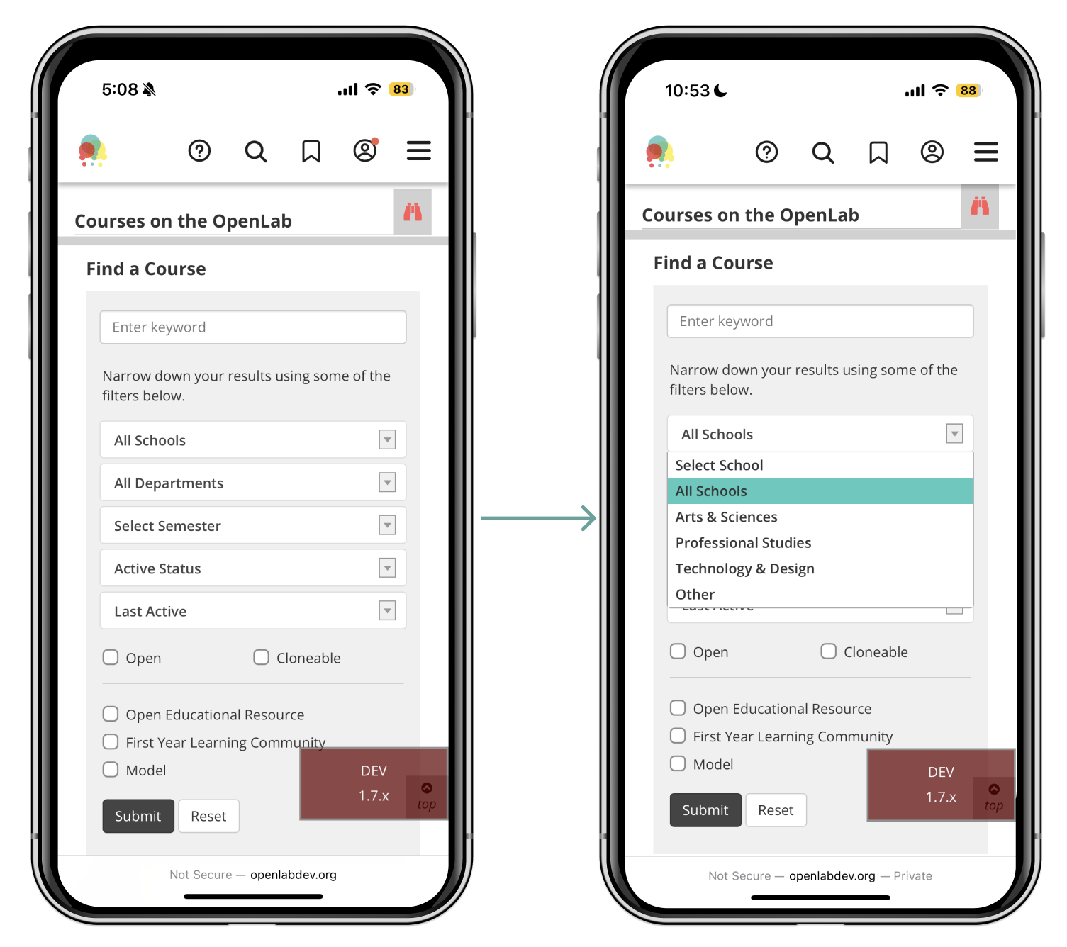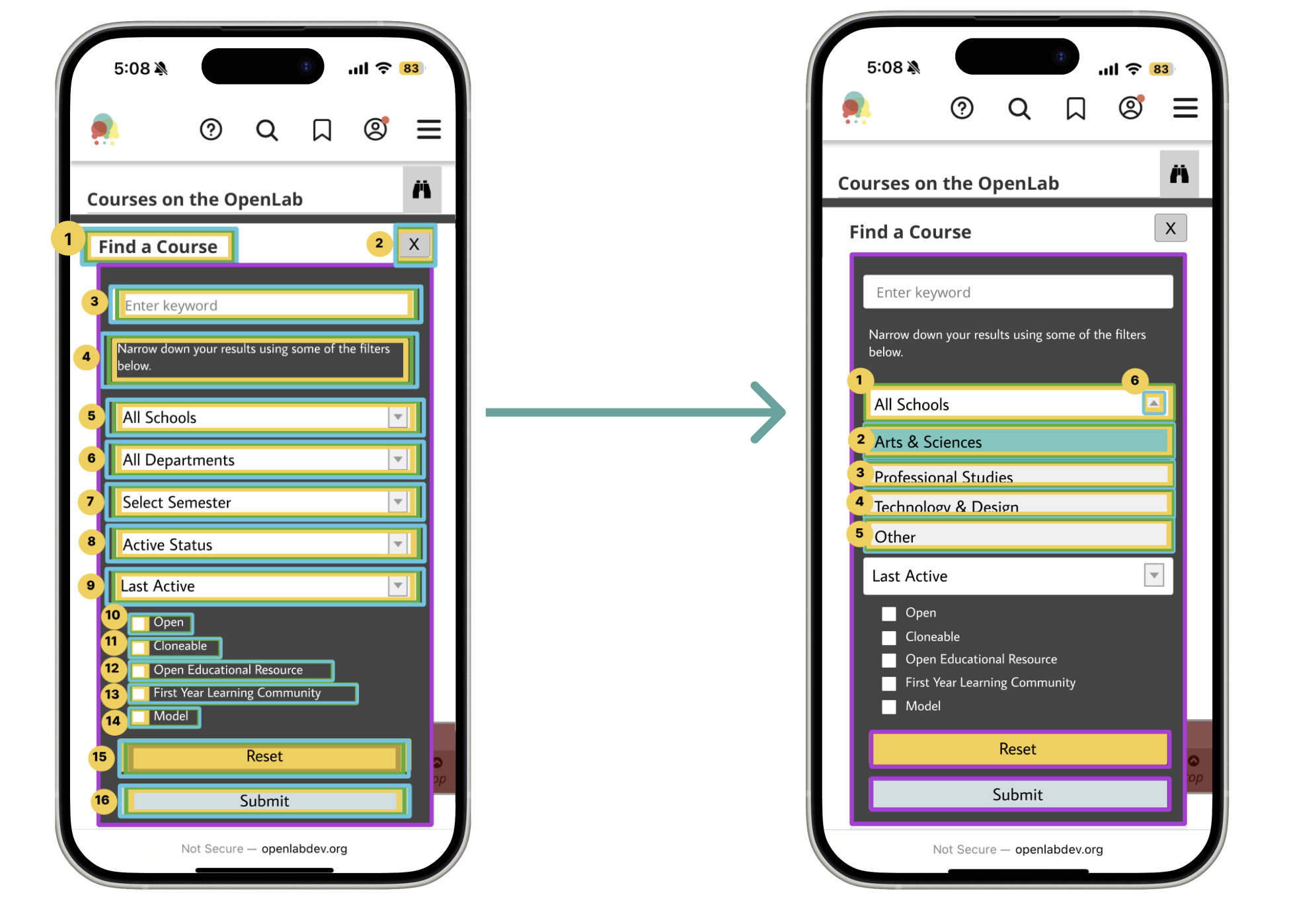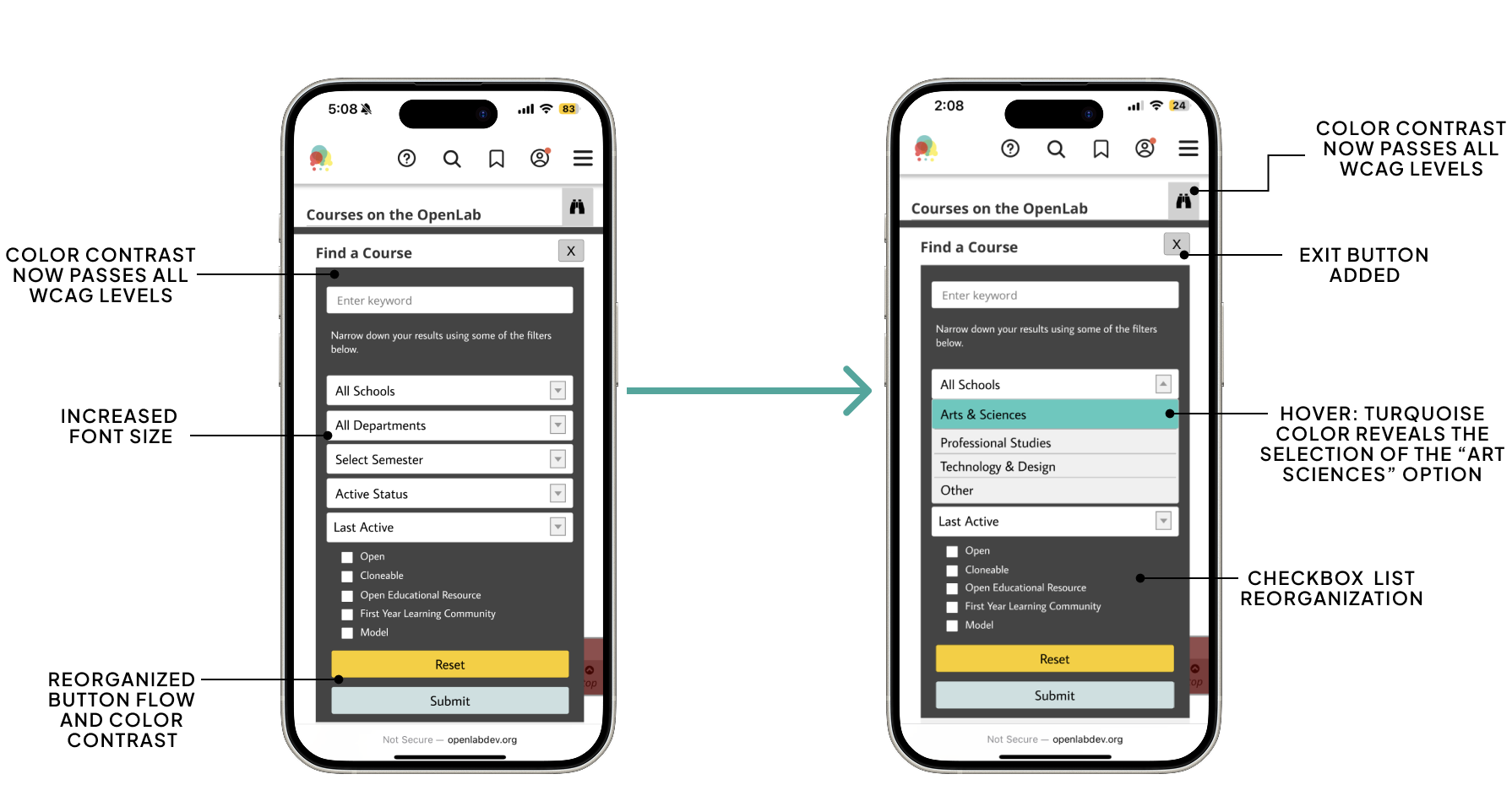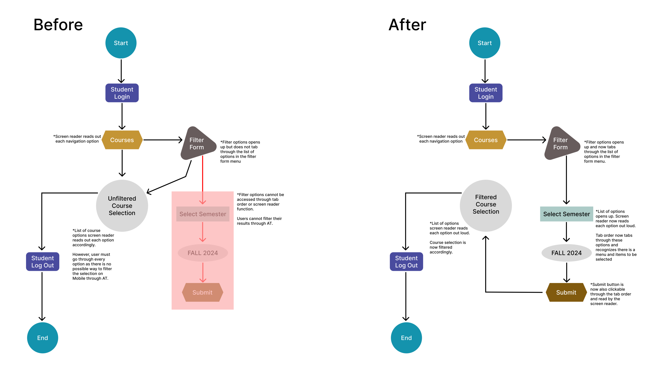 The filter form originally could not be tabbed through or read with the VoiceOver function. Therefore, users could not filter the web page to their needs via mobile. An example of this can be seen in the first user flow, as students would not be able to filter through their courses. The next image on the right reveals a solution where the filter form can now be tabbed through and read aloud, allowing students to filter their courses to their particular needs. This will now allow them to browse more quickly and have an easier time finding the specific items they need.