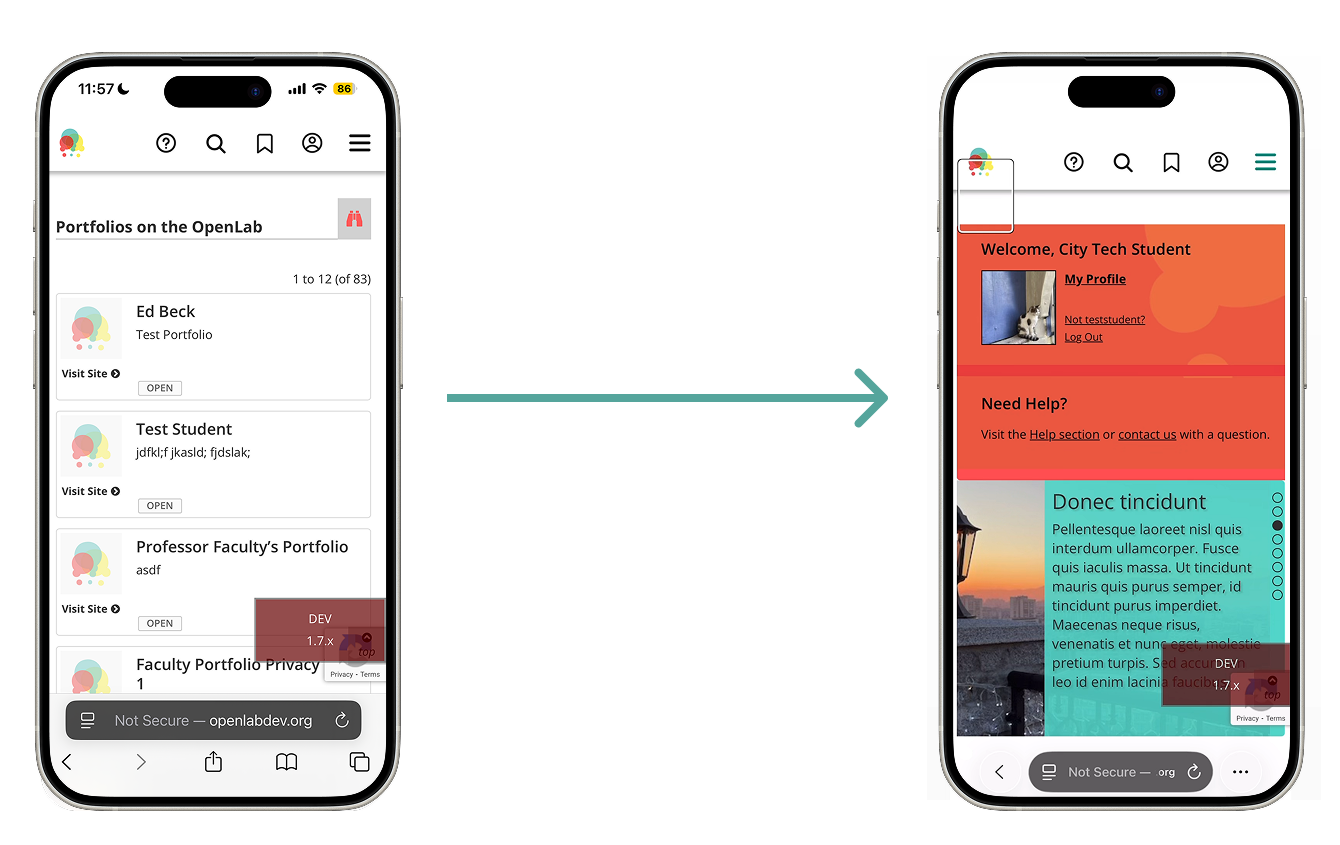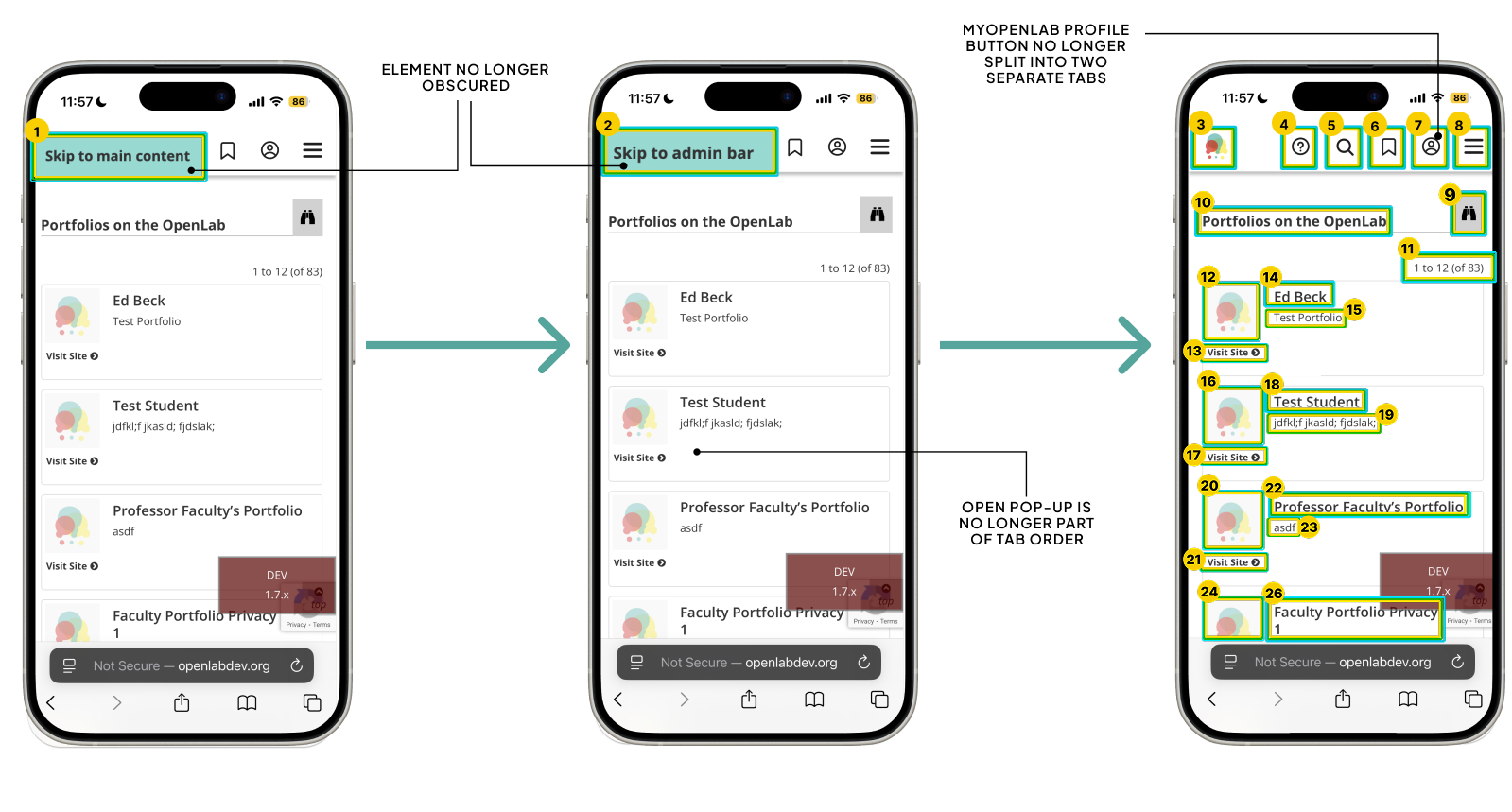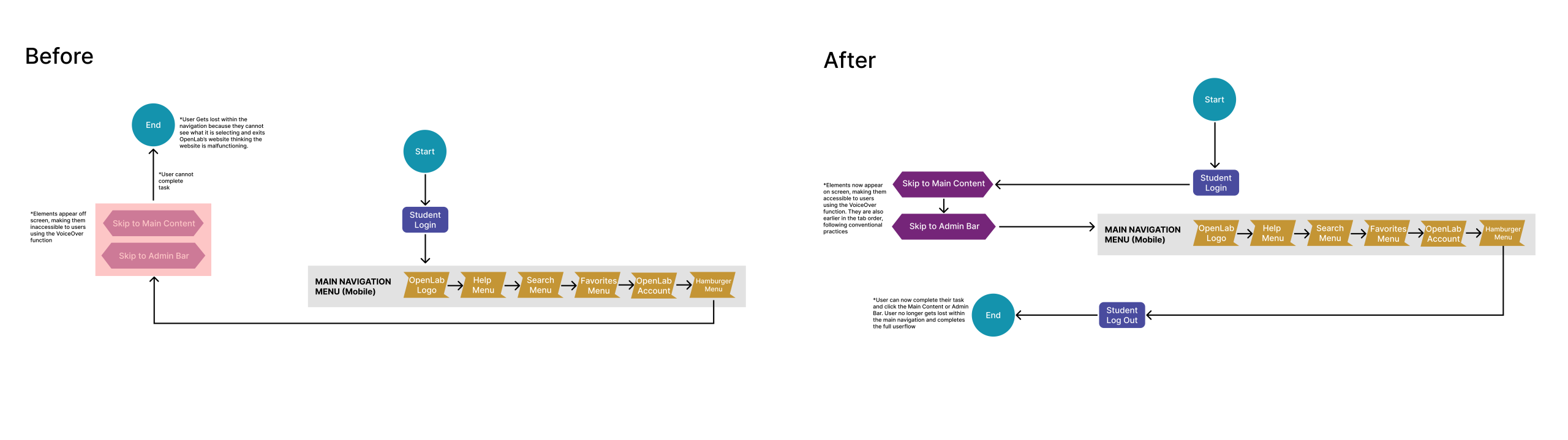 The first user flow demonstrates the problem since areas, such as the “Skip to Main Content” and “Skip to Admin Bar,” are located off-screen when on mobile. Users, therefore, cannot see the buttons whatsoever. This results in users who use the VoiceOver function exiting the website, thinking the tab order is most likely glitching or has frozen completely. The second user flow suggests moving up these two options in the tab order, as well as placing them in the top left of the screen so that users can not only see them but also use them when browsing OpenLab City Tech’s mobile version.