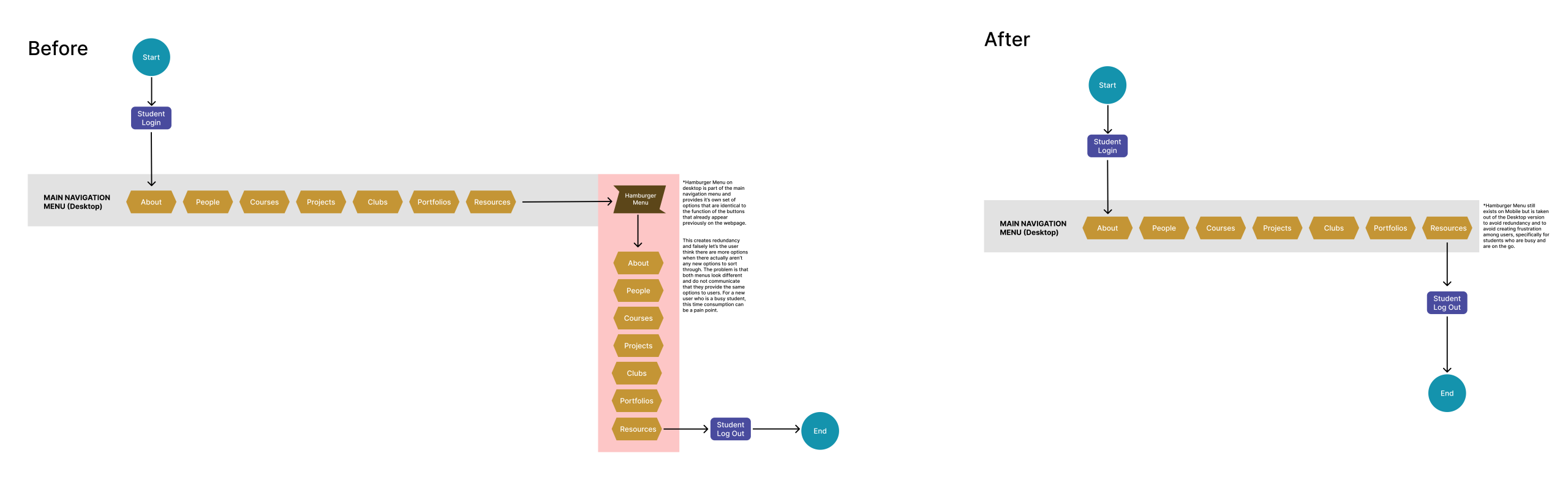 My role included doing an audit of the five directory pages with my team. These pages included the desktop and mobile versions of the Courses, Projects, Clubs, Portfolios and Resources pages, which then resulted in 10 final annotations. My role also included conducting secondary UX Research of users’ accessibility needs, whether it be researching information about City Tech students with disabilities or general assistive technology. The next step of my role was to analyze all WCAG 2.2 Guidelines to see which guidelines were not applicable, were met and not met. From these results, we were able to see what issues remained, and I was assigned finding 3, which involved the hamburger menu. I created all three user flows and then conducted a redesign of the hamburger menu, specifically regarding the desktop version, as the issue did not exist on mobile.