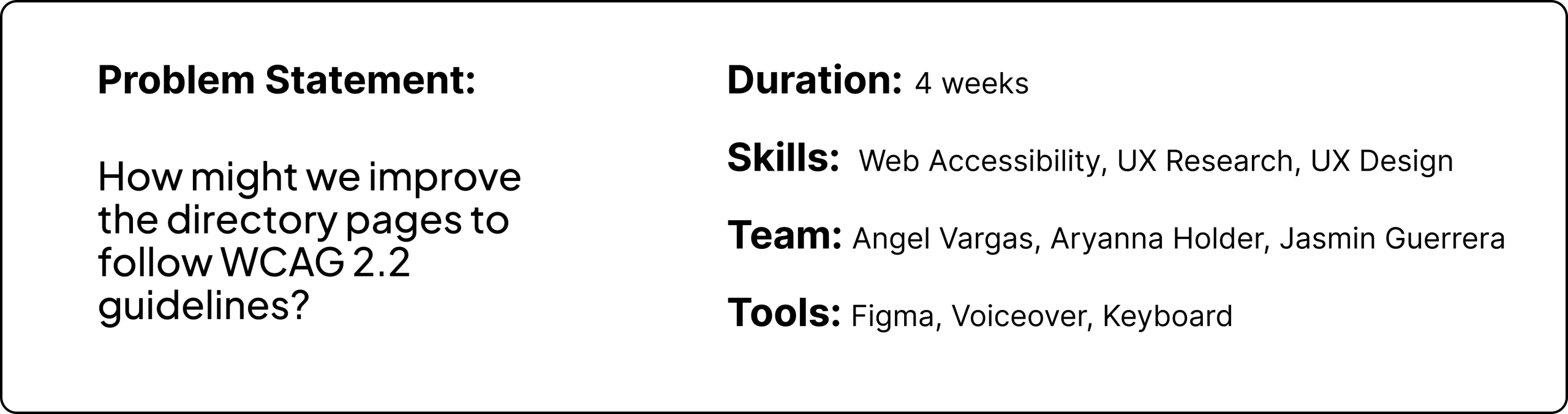 Our solutions focused on the errors we identified on every directory page. If we had had more time, we could have explored each page’s specific issues further. For example, some errors varied or were inconsistent, such as images without focus indicators only happening on certain pages. Another example is skipped tabs, like missing page numbers, which only occurred on one directory page.