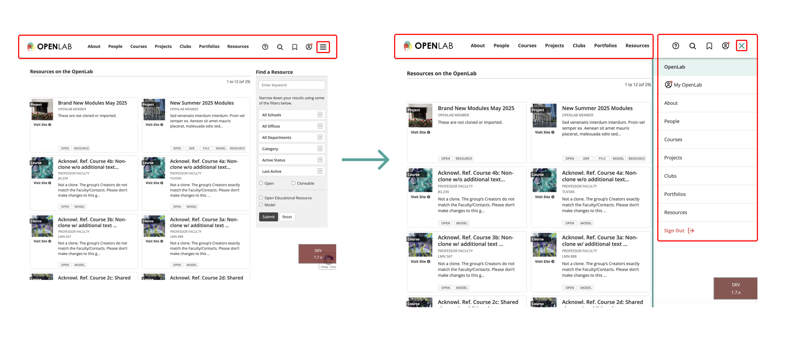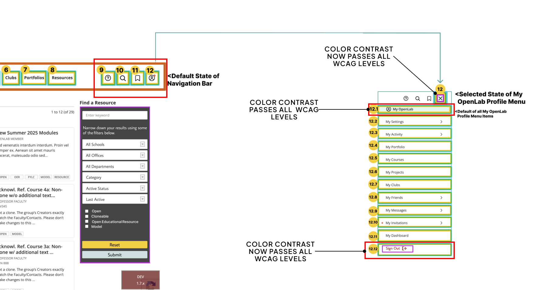 The recommendation to solve this issue is a simple one. The recommendation involves removing the hamburger menu altogether when it comes to the desktop version. This would allow users to interact with the website without having the same options repeated a second time. The red “sign out” button, as well as the green “X” icon, also now have slightly darker shades to pass all possible WCAG levels for color contrast, too. The “sign out” button is also now only located in the MyOpenLab menu, instead of also in the hamburger menu.