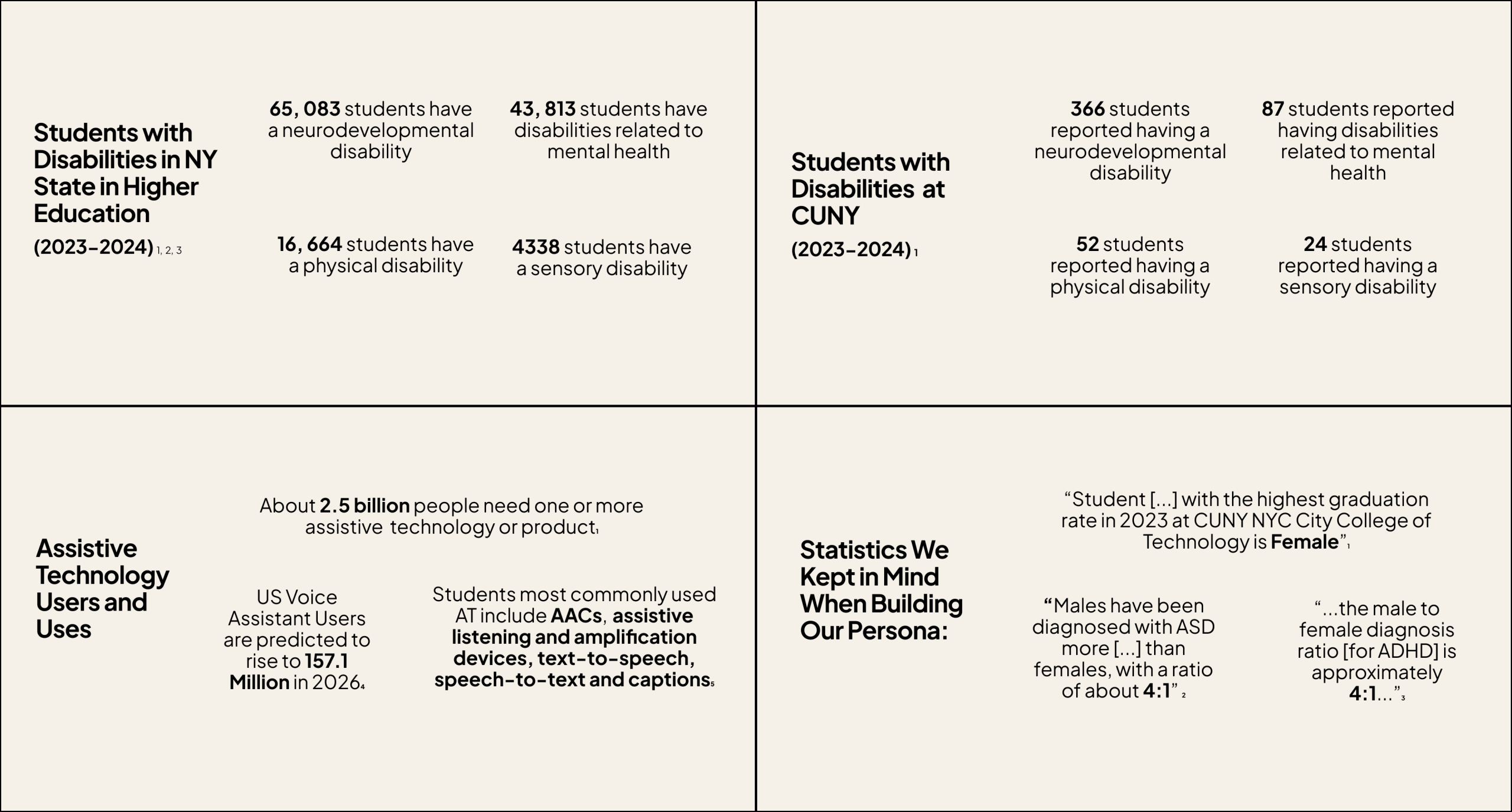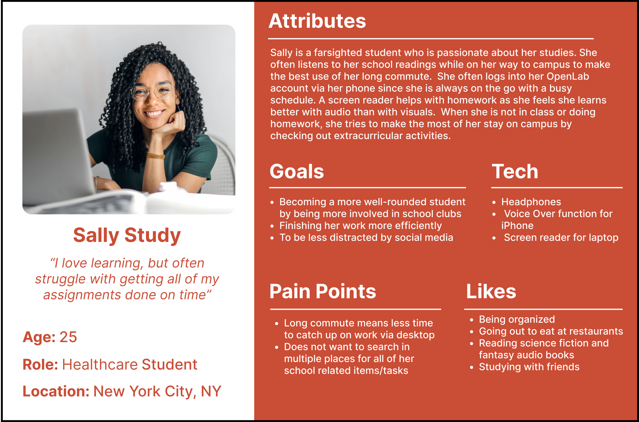 Research included the biggest disability groups among students in higher education, the top disability groups in CUNY, and diverse assistive technologies among users. This secondary research led to the construction of a persona named Sally Study.