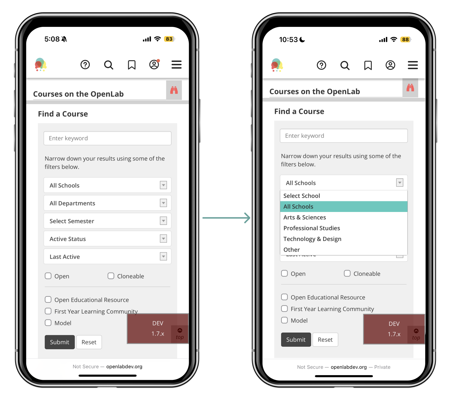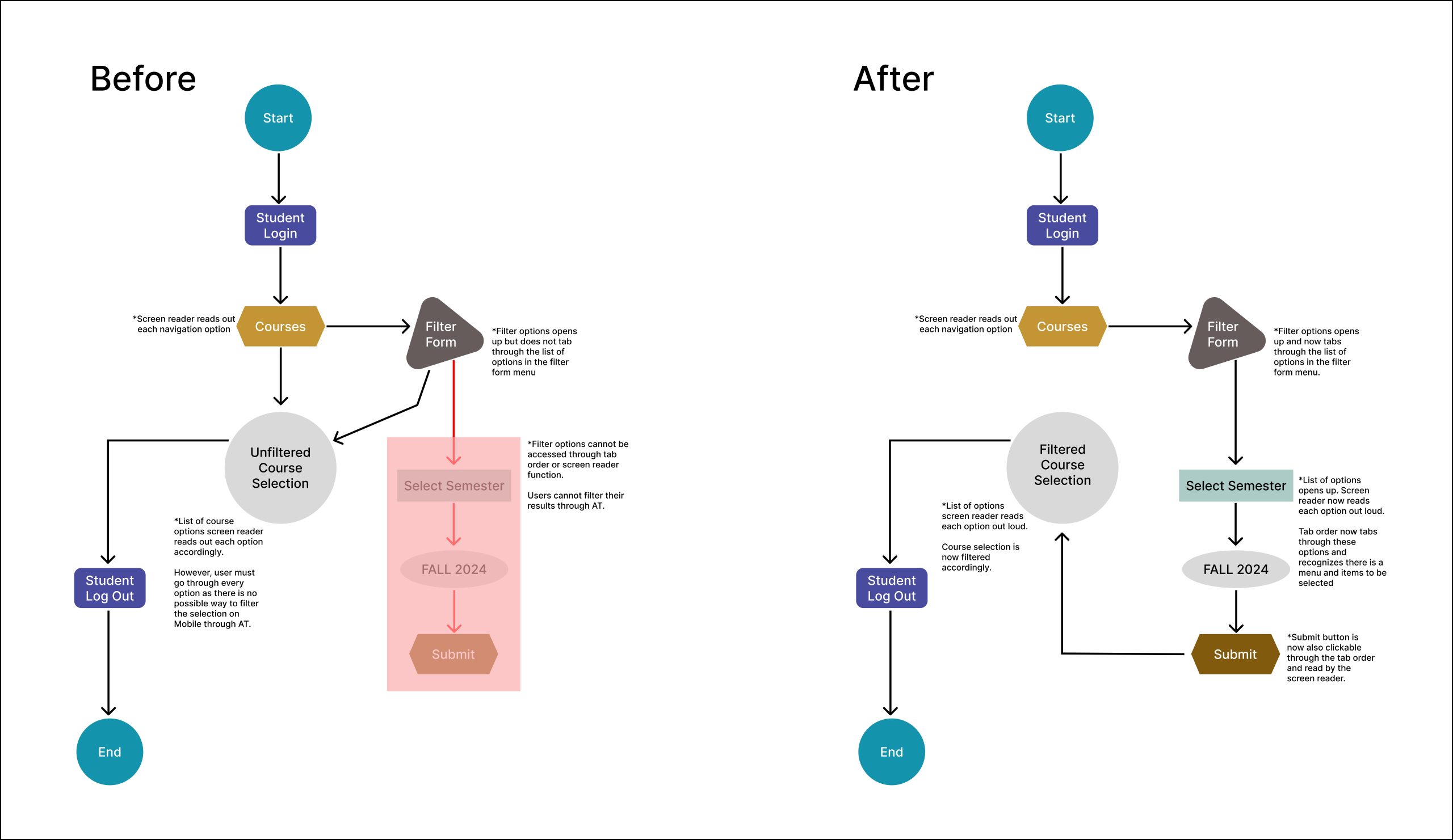 The filter form originally could not be tabbed through or read with the VoiceOver function. Therefore, users could not filter the web page to their needs via mobile. An example of this can be seen in the first user flow, as students would not be able to filter through their courses. The next image on the right reveals a solution where the filter form can now be tabbed through and read aloud, allowing students to filter their courses to their particular needs. This will now allow them to browse more quickly and have an easier time finding the specific items they need.