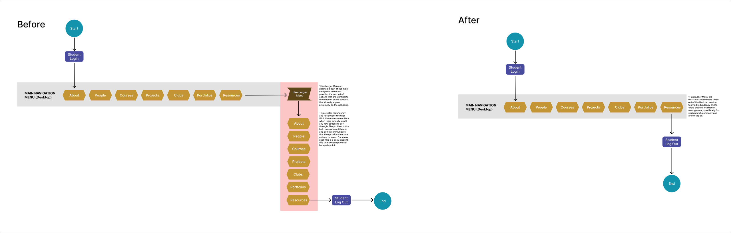 My role included doing an audit of the five directory pages with my team. These pages included the desktop and mobile versions of the Courses, Projects, Clubs, Portfolios and Resources pages, which then resulted in 10 final annotations. My role also included conducting secondary UX Research of users’ accessibility needs, whether it be researching information about City Tech students with disabilities or general assistive technology. The next step of my role was to analyze all WCAG 2.2 Guidelines to see which guidelines were not applicable, were met and not met. From these results, we were able to see what issues remained, and I was assigned finding 3, which involved the hamburger menu. I created all three user flows and then conducted a redesign of the hamburger menu, specifically regarding the desktop version, as the issue did not exist on mobile.