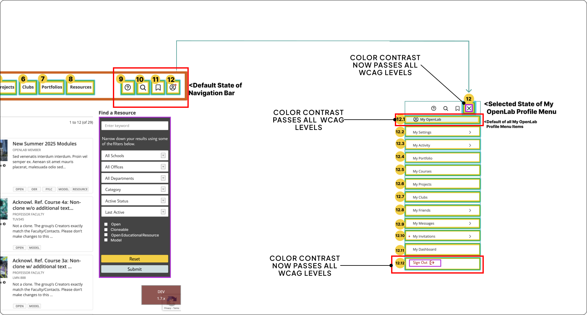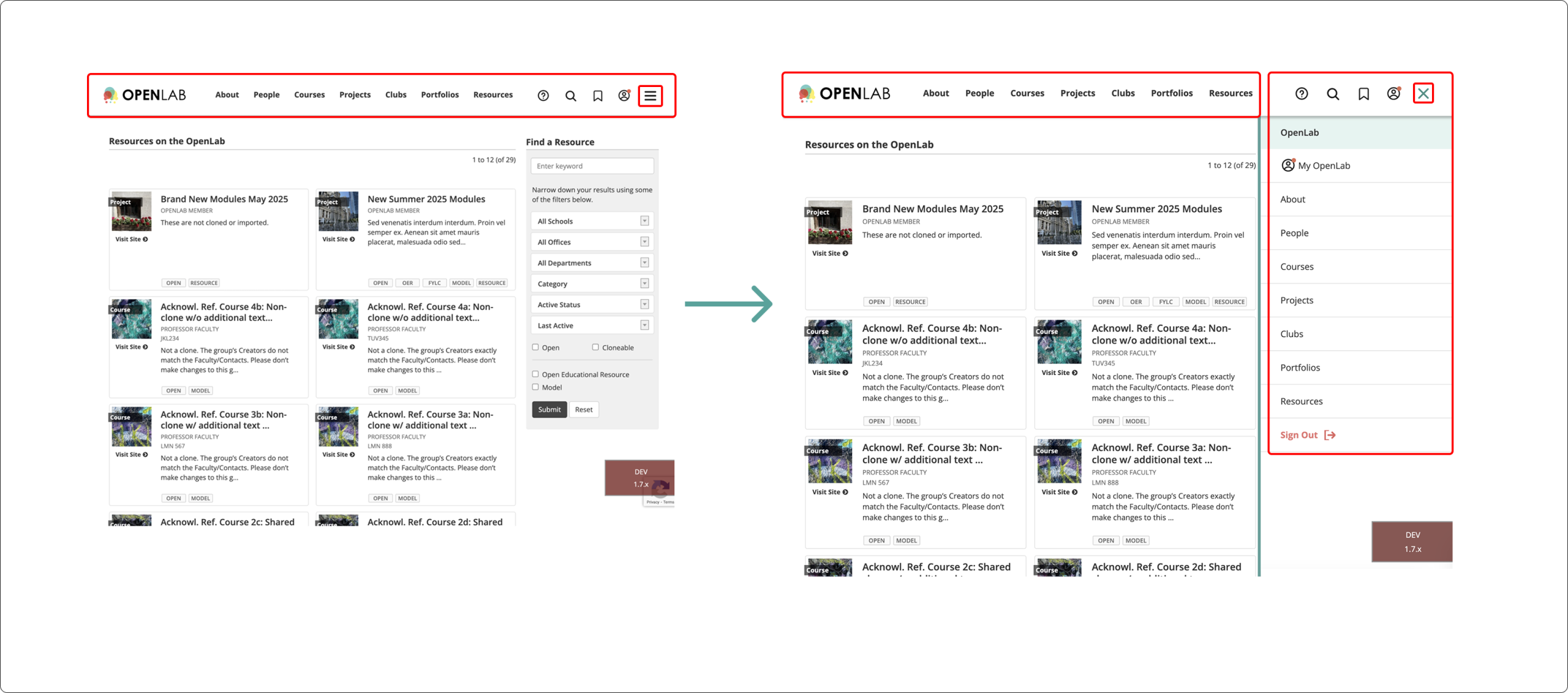 The recommendation to solve this issue is a simple one. The recommendation involves removing the hamburger menu altogether when it comes to the desktop version. This would allow users to interact with the website without having the same options repeated a second time. The red “sign out” button, as well as the green “X” icon, also now have slightly darker shades to pass all possible WCAG levels for color contrast, too. The “sign out” button is also now only located in the MyOpenLab menu, instead of also in the hamburger menu.