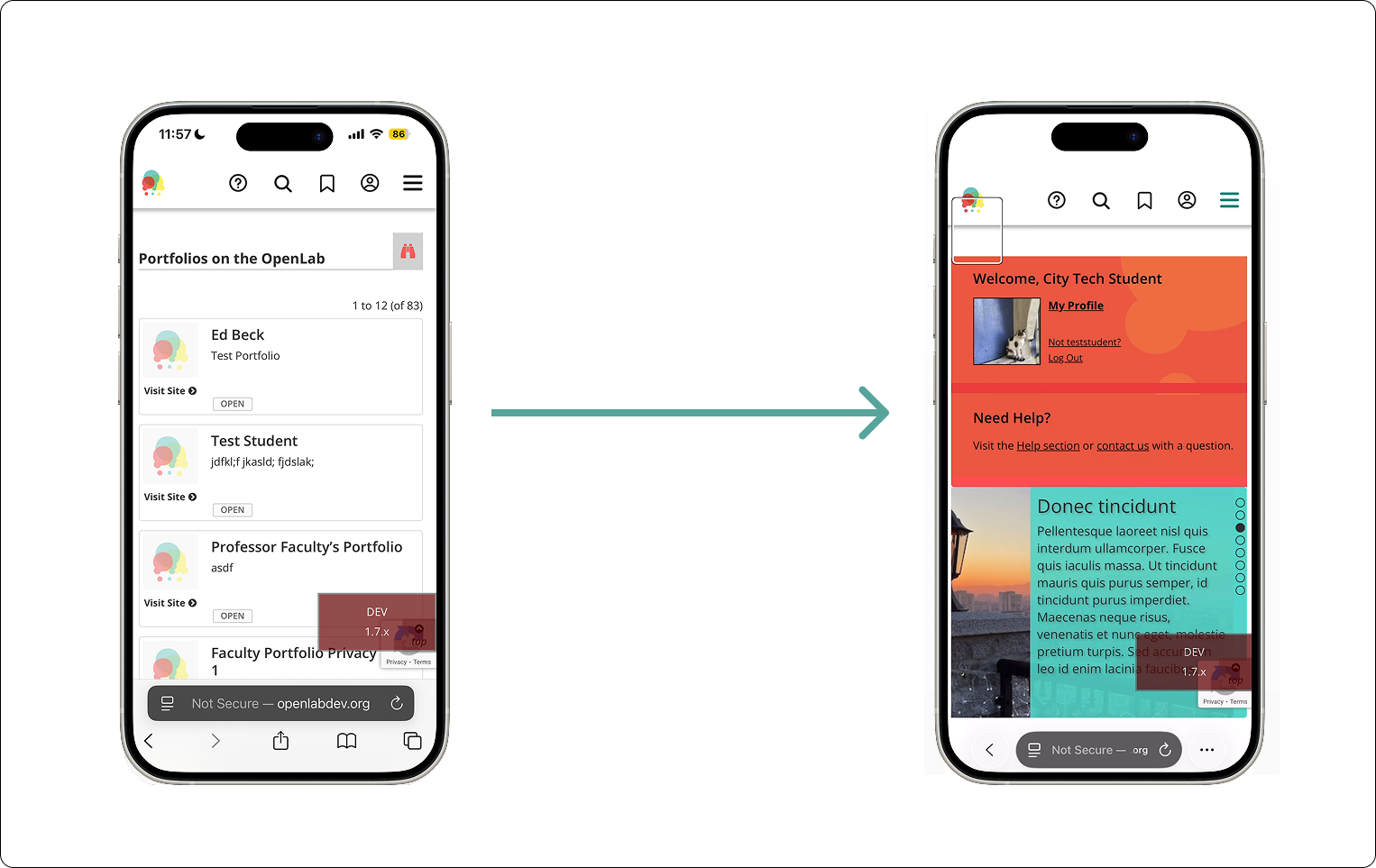 The first user flow demonstrates the problem since areas, such as the “Skip to Main Content” and “Skip to Admin Bar,” are located off-screen when on mobile. Users, therefore, cannot see the buttons whatsoever. This results in users who use the VoiceOver function exiting the website, thinking the tab order is most likely glitching or has frozen completely. The second user flow suggests moving up these two options in the tab order, as well as placing them in the top left of the screen so that users can not only see them but also use them when browsing OpenLab City Tech’s mobile version.