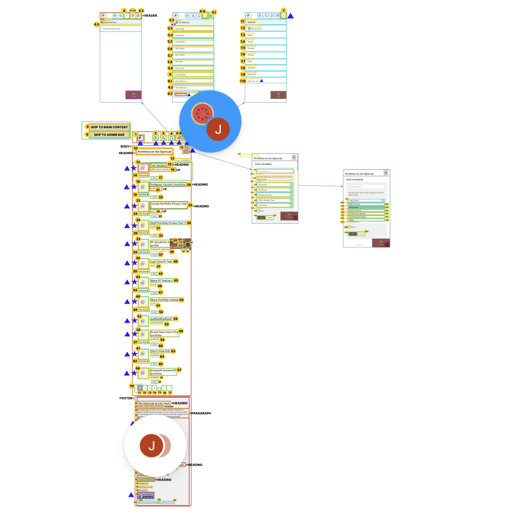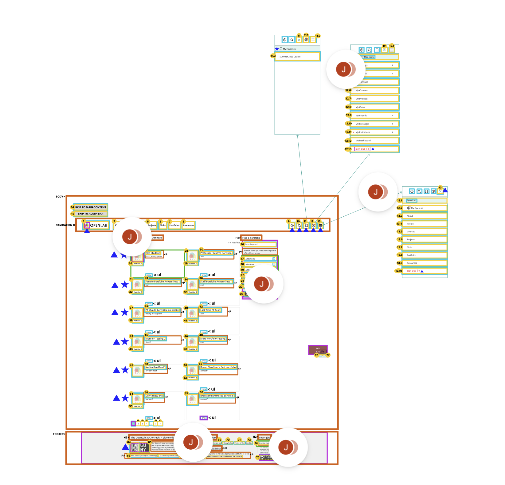 We began by auditing each directory page. OpenLab City Tech has 5 directory pages in total: Courses, Projects, Clubs, Portfolio, and Resources. Both Desktop and Mobile versions were analyzed, resulting in 10 annotations. The annotations analyze the tab order, screen reader, color contrast, focus indicators, semantic HTML and ARIA implementation. These were the main findings within desktop and mobile.