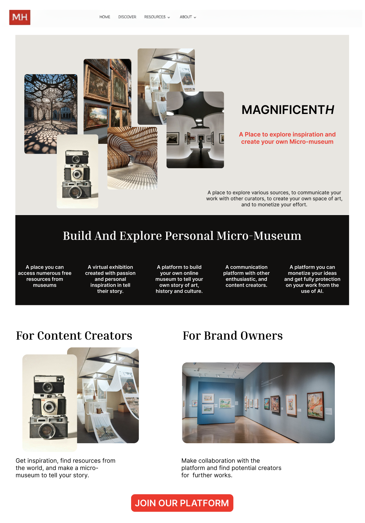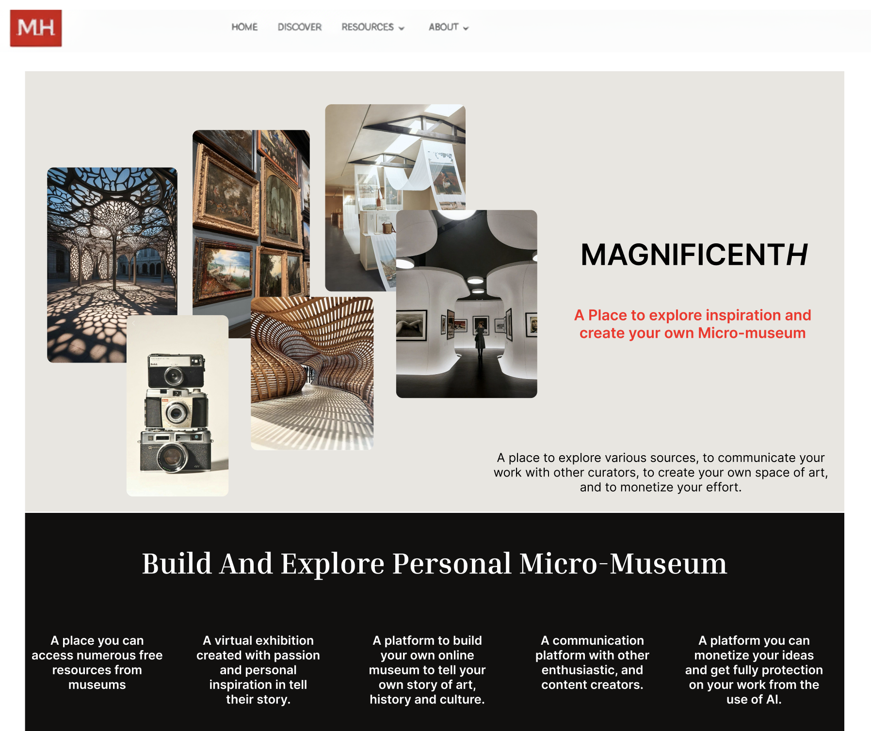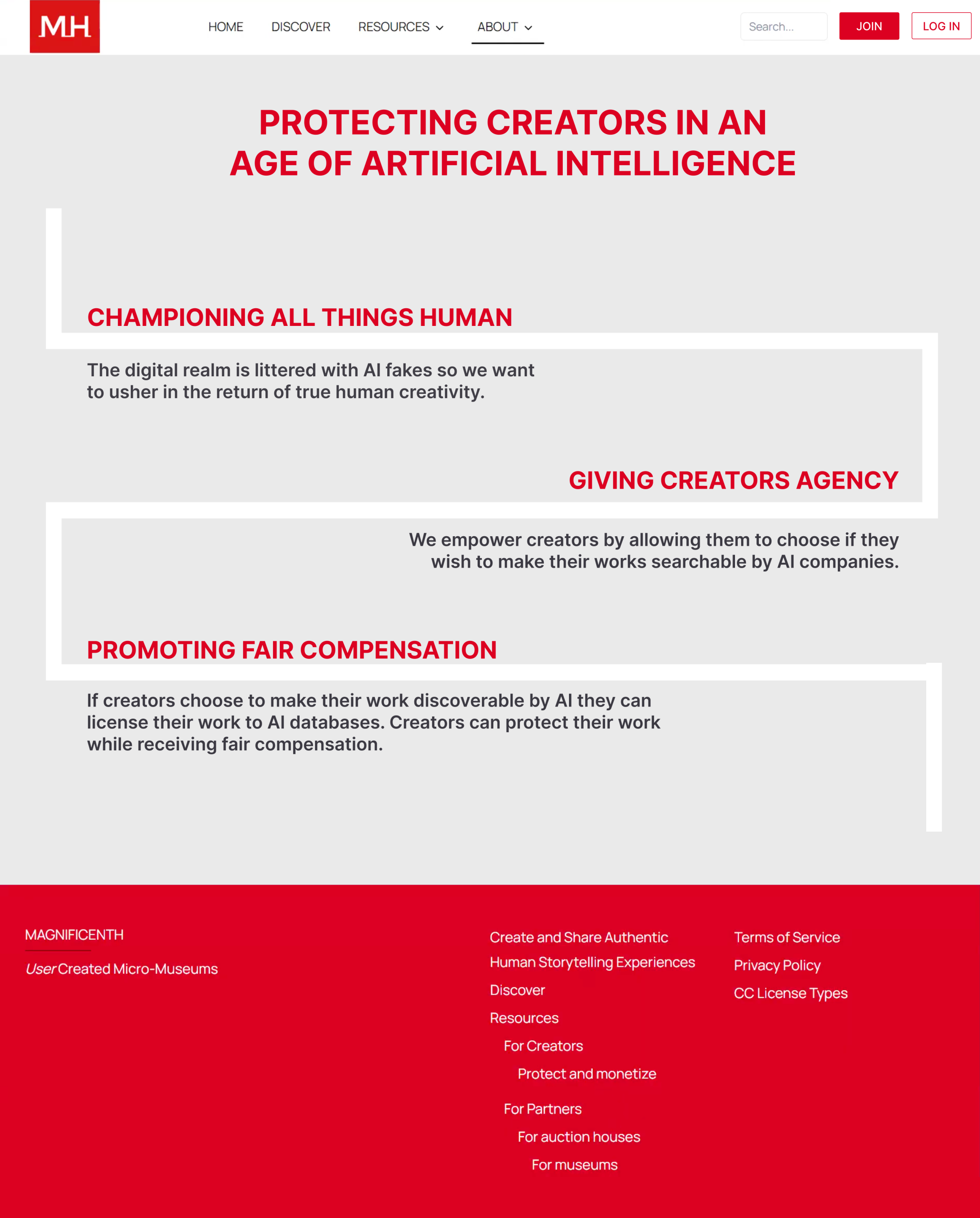 The client revealed that MagnificentH was indeed an artistic space for the creation of digital micro-museums. However, MagnificentH does not promote AI, but instead gives creators their agency back by choosing if they want to receive monetization from AI companies to acquire their work. This allowed us to realize there might already be a lack of clarification regarding AI information on the website that we needed to address.