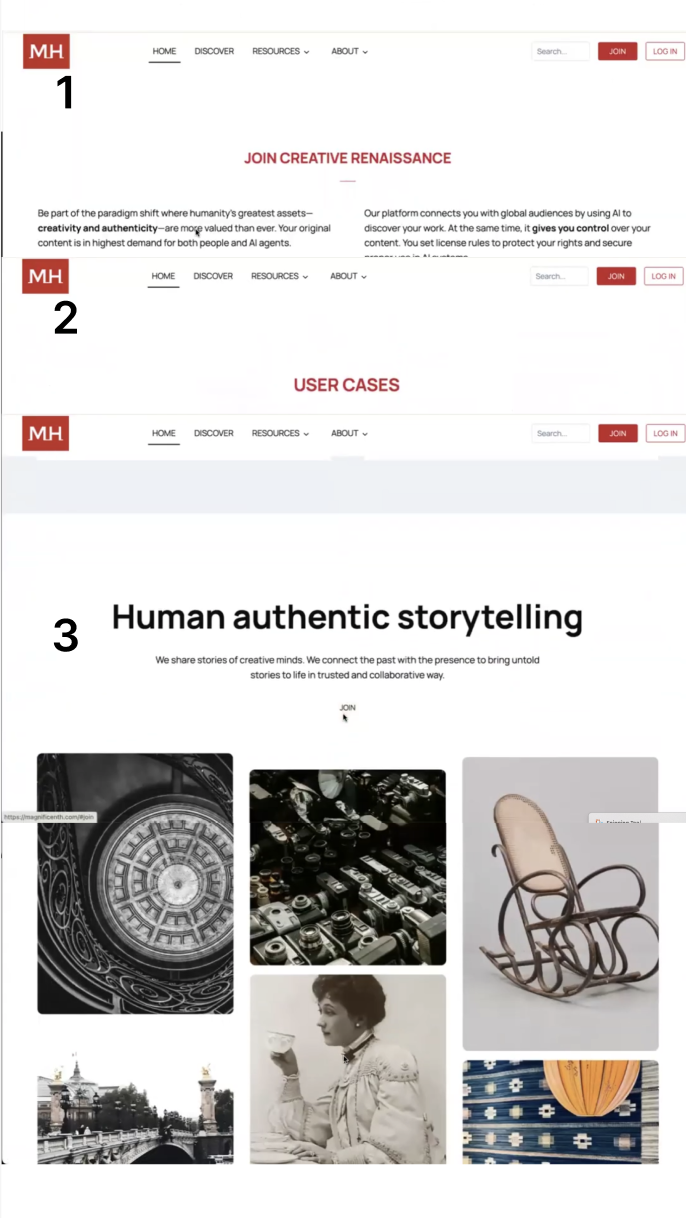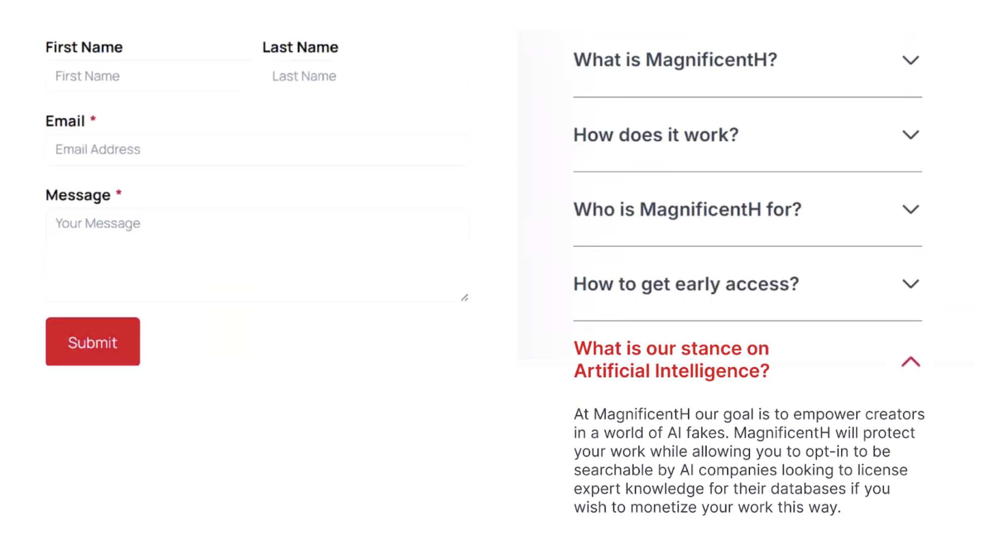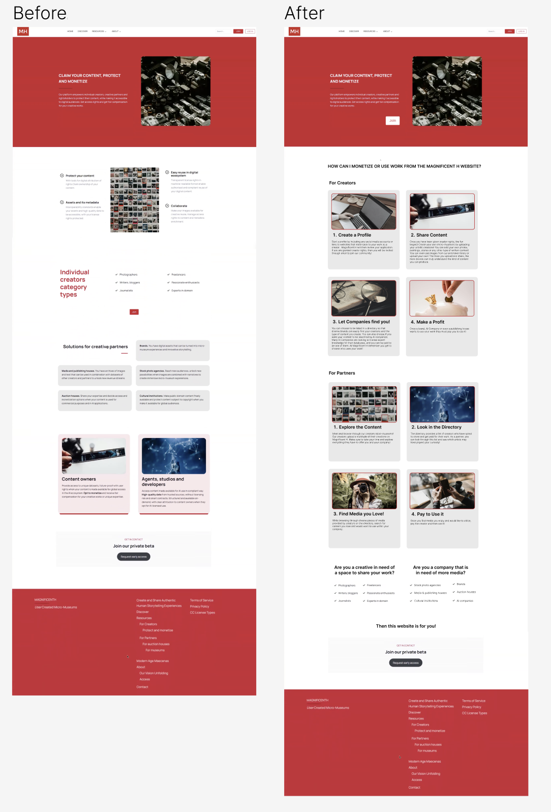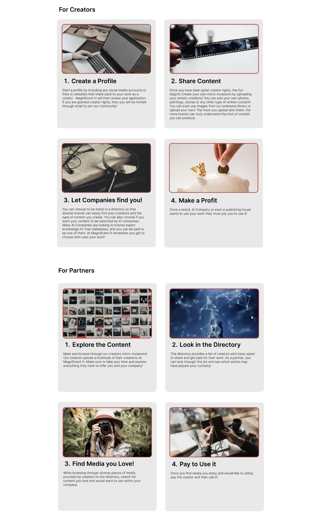 The client revealed that MagnificentH was indeed an artistic space for the creation of digital micro-museums. However, MagnificentH does not promote AI, but instead gives creators their agency back by choosing if they want to receive monetization from AI companies to acquire their work. This allowed us to realize there might already be a lack of clarification regarding AI information on the website that we needed to address.