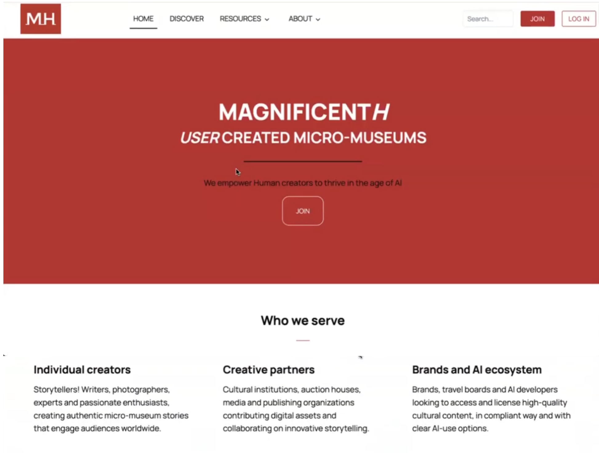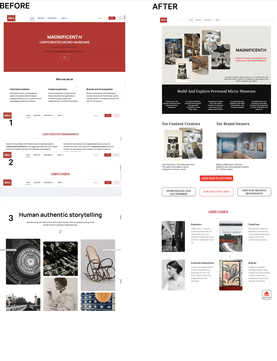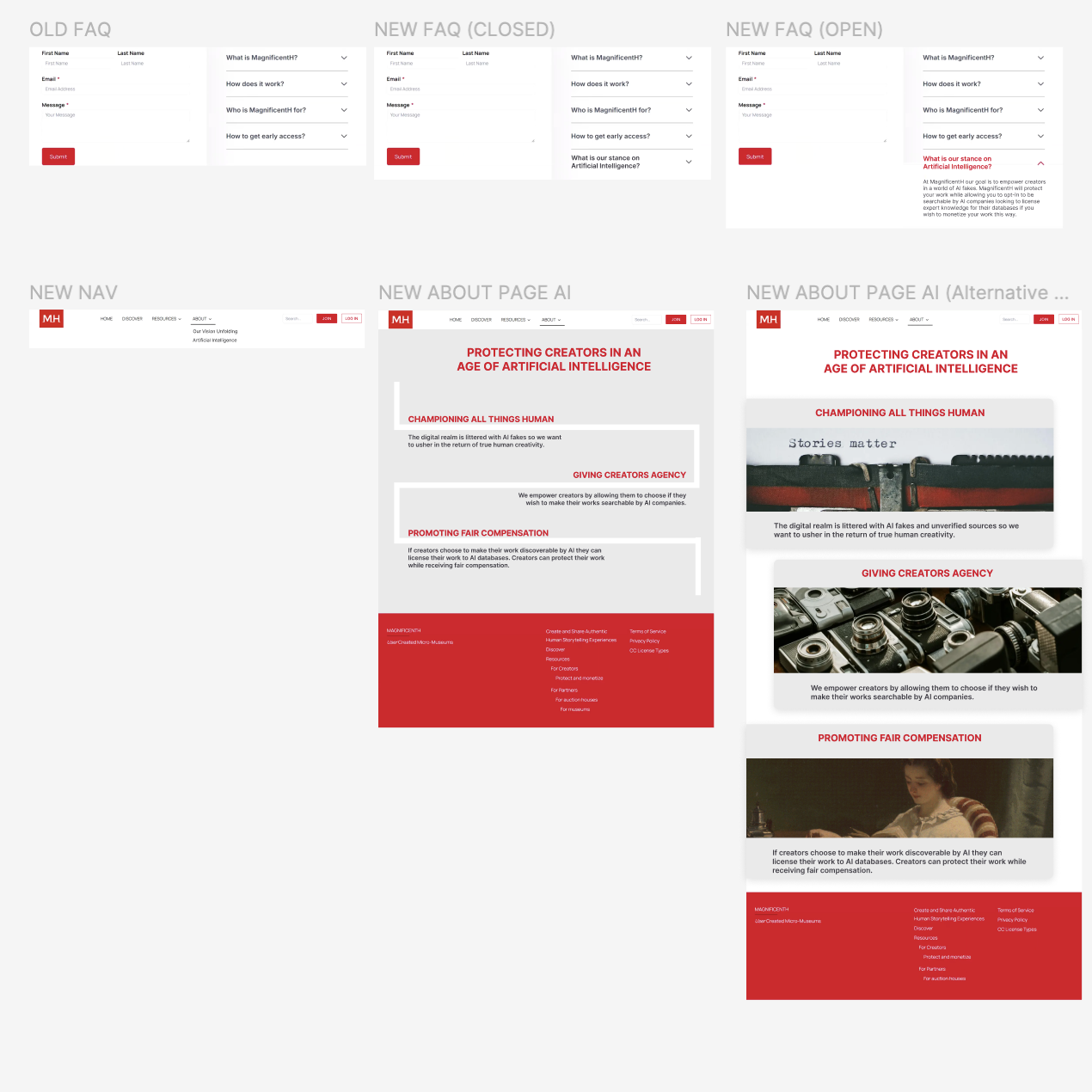 The client revealed that MagnificentH was indeed an artistic space for the creation of digital micro-museums. However, MagnificentH does not promote AI, but instead gives creators their agency back by choosing if they want to receive monetization from AI companies to acquire their work. This allowed us to realize there might already be a lack of clarification regarding AI information on the website that we needed to address.