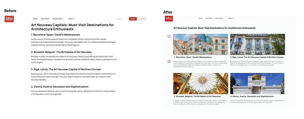 - Adding visuals for each architectural style: we redesigned the page by inserting image such as the example of Casa Batlló in the Barcelona: Gaudí’s Masterpieces section, which would improve comprehension and engagement for users.