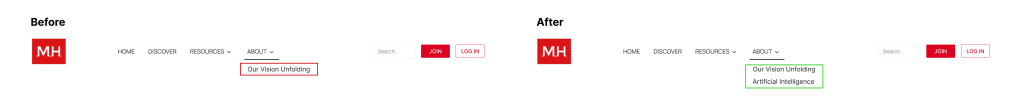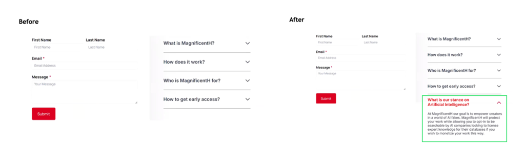 - Usability testing showed that users naturally looked to the FAQ section and the “About” tab when searching for information about AI. Based on this behavior, we updated the FAQ to directly address MagnificentH’s stance on AI and added a subpage of AI under the “About” section. The redesigned content highlights MagnificentH’s core value of protecting creators, helping build trust by communicating its approach to AI.