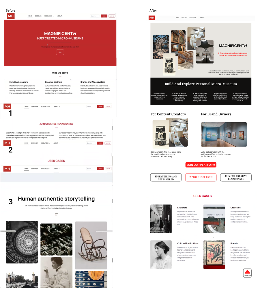 MagnificentH is a micro-museum platform contain knowledge and cultural storytelling, with the goal of bringing museums into a new digital era. The platform allows museums and creators to showcase visual content that exposes the public to art and history in an authentic way, offering an alternative way to avoid generated artificial intelligence media. The goal of this study was to identify usability issues that potential users, especially younger audiences such as young millennials and Gen Z in North America, may encounter when navigating the website, and to provide actionable recommendations to better communicate the platform’s mission.