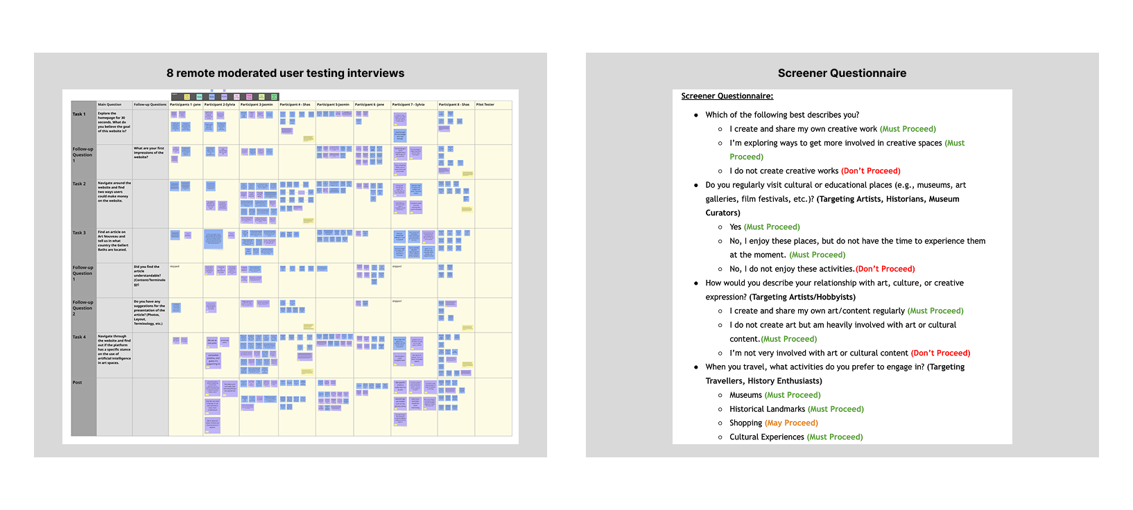 - Screener Questionnaire: Identified target user profiles and created a screener form to ensure participants were qualified for the study: In this study, we recruited young adults who are interested in art, history, photography, architecture, travel, and cultural storytelling.