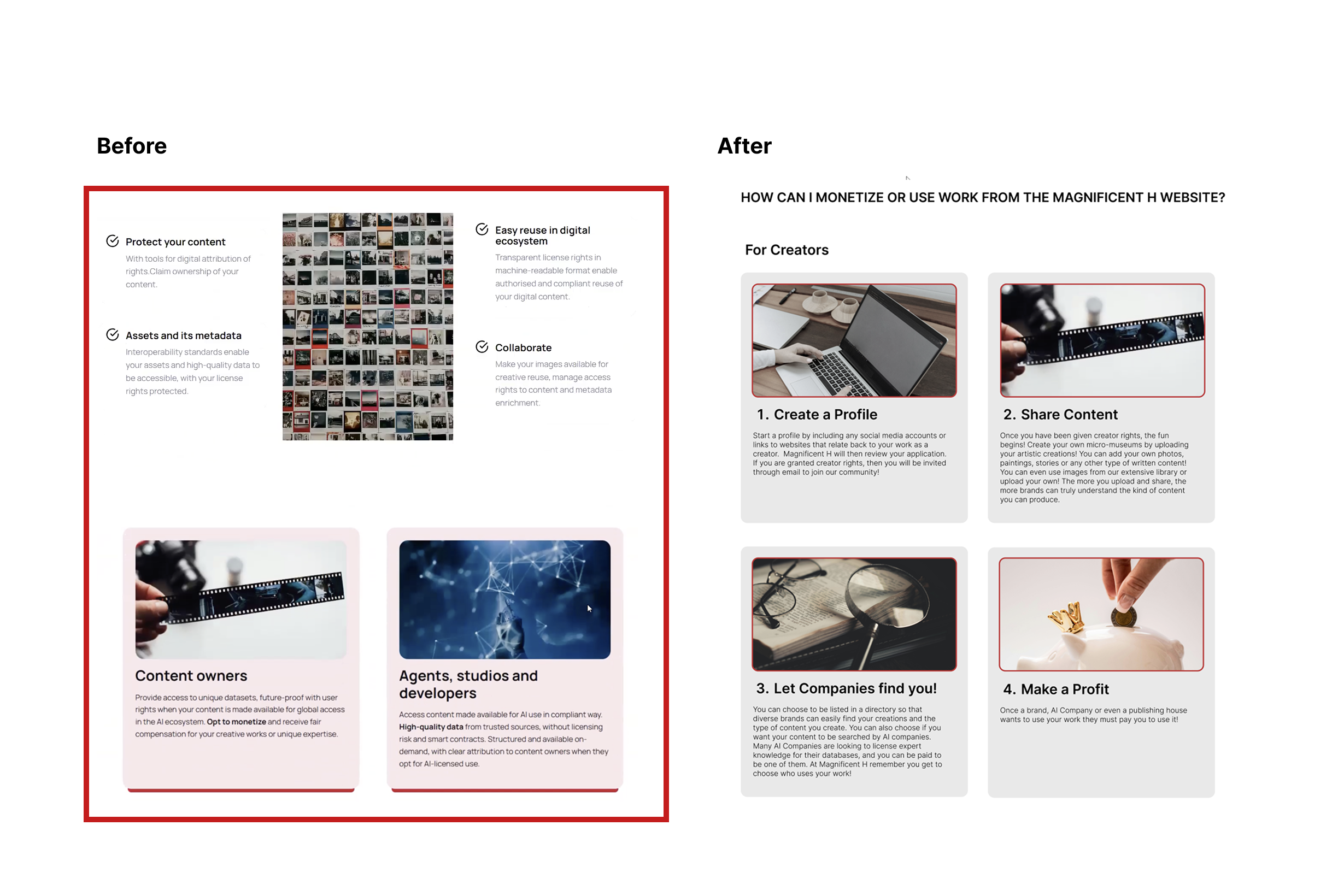 - To improve clarity in this section of the MagnificentH website, certain sections and blocks of text were removed or reorganized. We redesigned the monetization instructions into a clear, step-by-step process for creators, as moderated remote testing revealed this area caused the most confusion among participants.