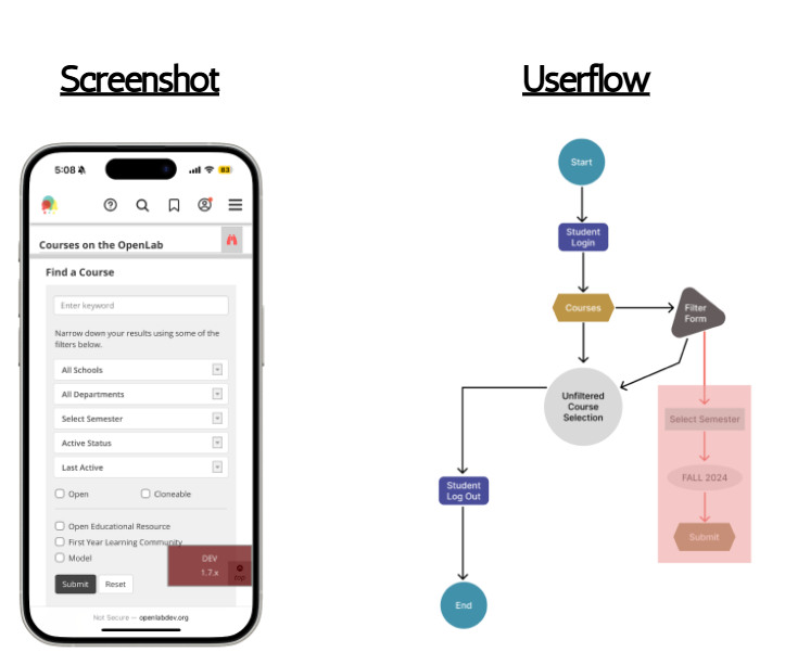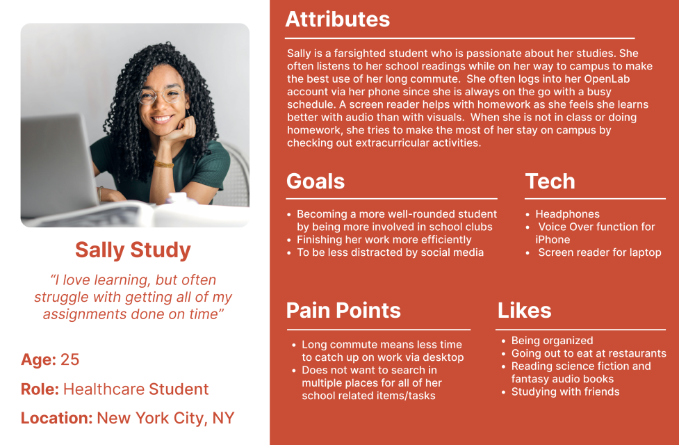 This project was assigned to my class as our final for the semester. Our client, OpenLab at City Tech, required a total redesign of their website/digital offerings, with an emphasis on inclusivity. Our class’ overall goal was to provide the OpenLab team with an accessibility-first redesign of their website. My team’s role specifically in this redesign was to tackle the website’s main directory pages. To better understand the end-users of the website, we conducted research and used those insights to craft a persona that we built our product around. Using the tools provided, we made some wireframes to showcase the best way(s) to make this website accessible and inclusive for all. We framed all our work around the following problem statement: How might we improve OpenLab’s directory to follow WCAG 2.2 guidelines?