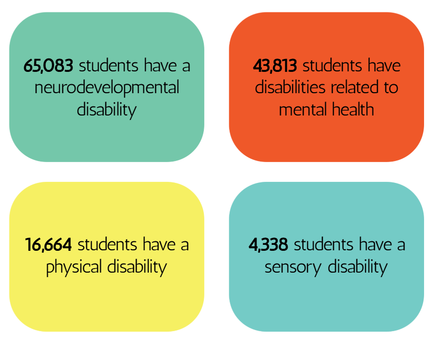 For our second stage of research, we gathered statistics about our target audience: higher education students. Of that group, we narrowed it down a bit more to students with disabilities in New York State. At a high-level, here is what we found: