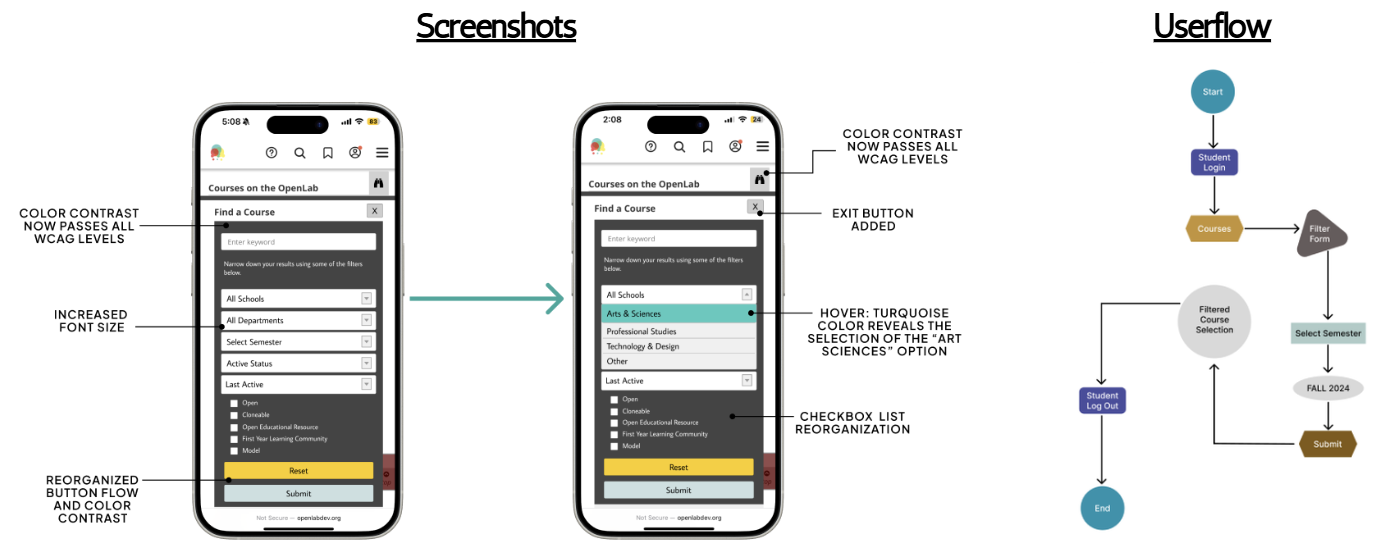 This project was assigned to my class as our final for the semester. Our client, OpenLab at City Tech, required a total redesign of their website/digital offerings, with an emphasis on inclusivity. Our class’ overall goal was to provide the OpenLab team with an accessibility-first redesign of their website. My team’s role specifically in this redesign was to tackle the website’s main directory pages. To better understand the end-users of the website, we conducted research and used those insights to craft a persona that we built our product around. Using the tools provided, we made some wireframes to showcase the best way(s) to make this website accessible and inclusive for all. We framed all our work around the following problem statement: How might we improve OpenLab’s directory to follow WCAG 2.2 guidelines?
