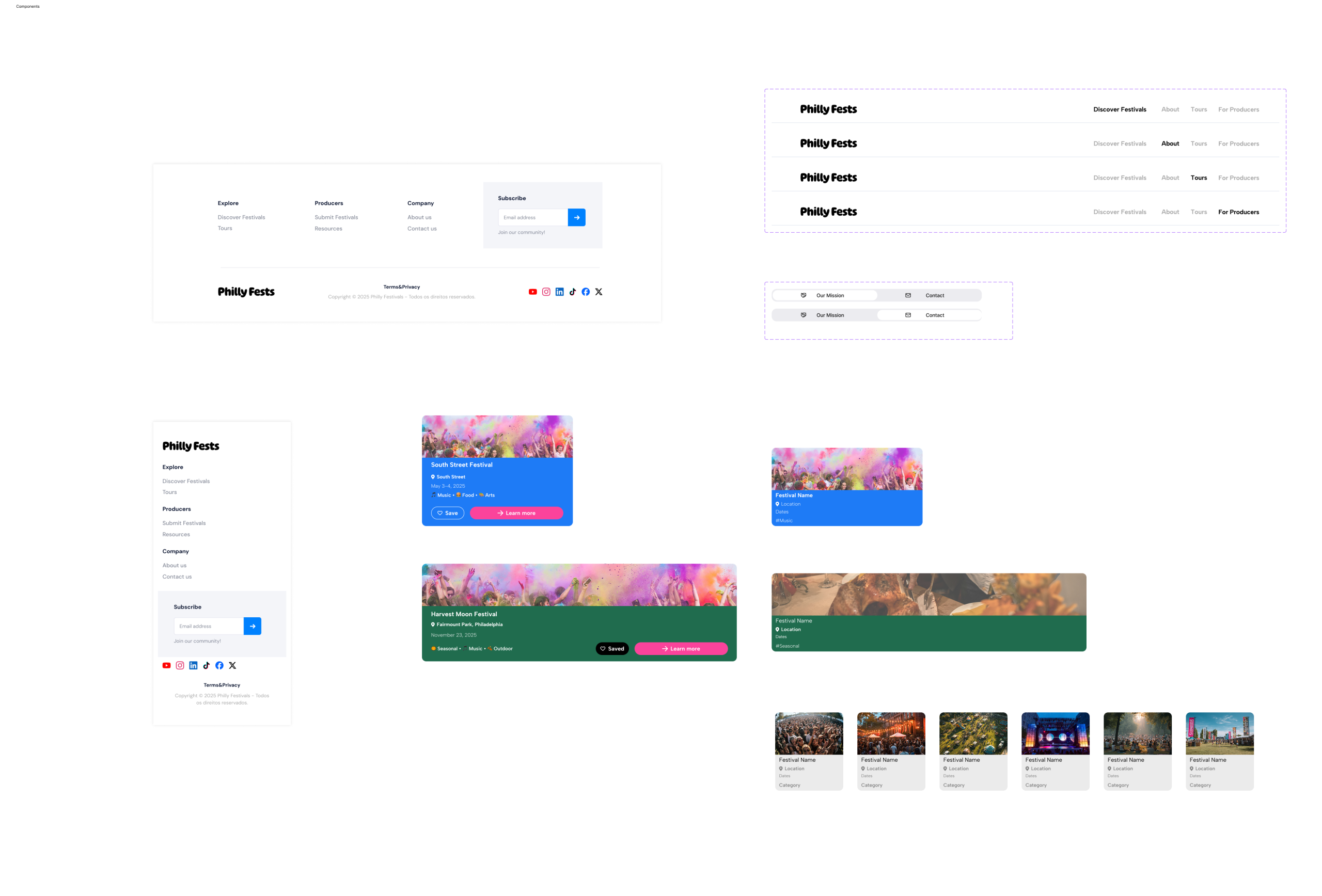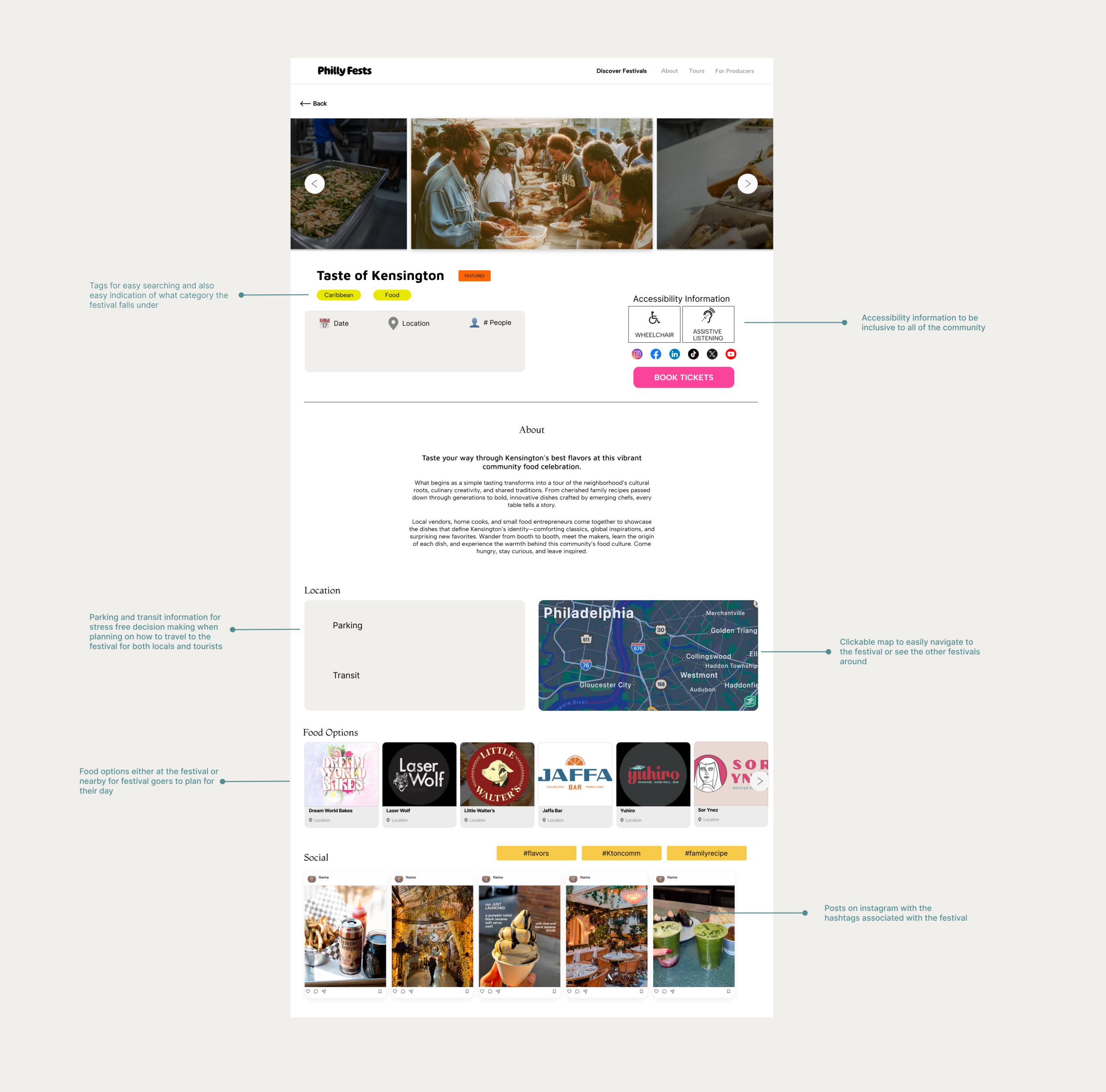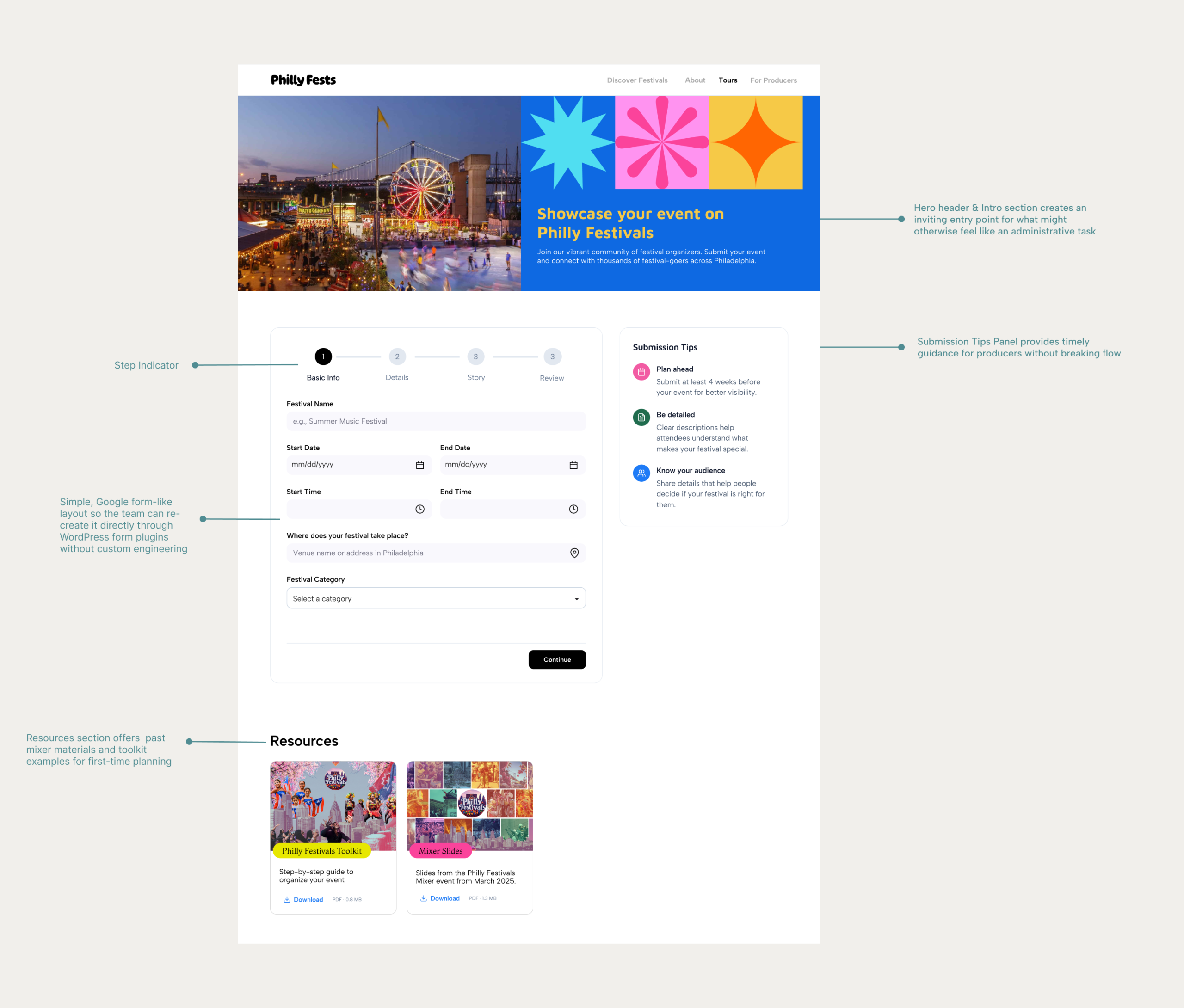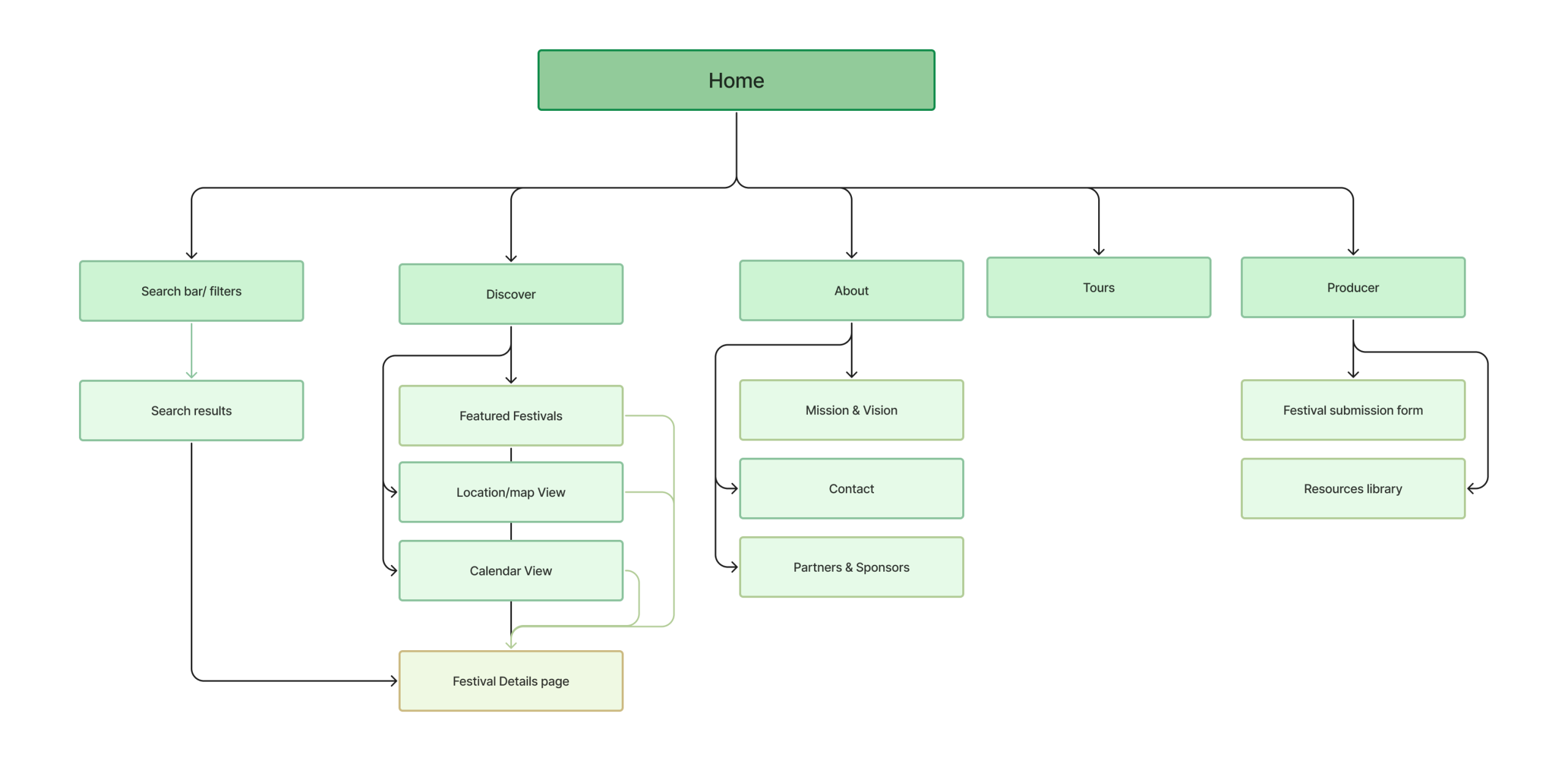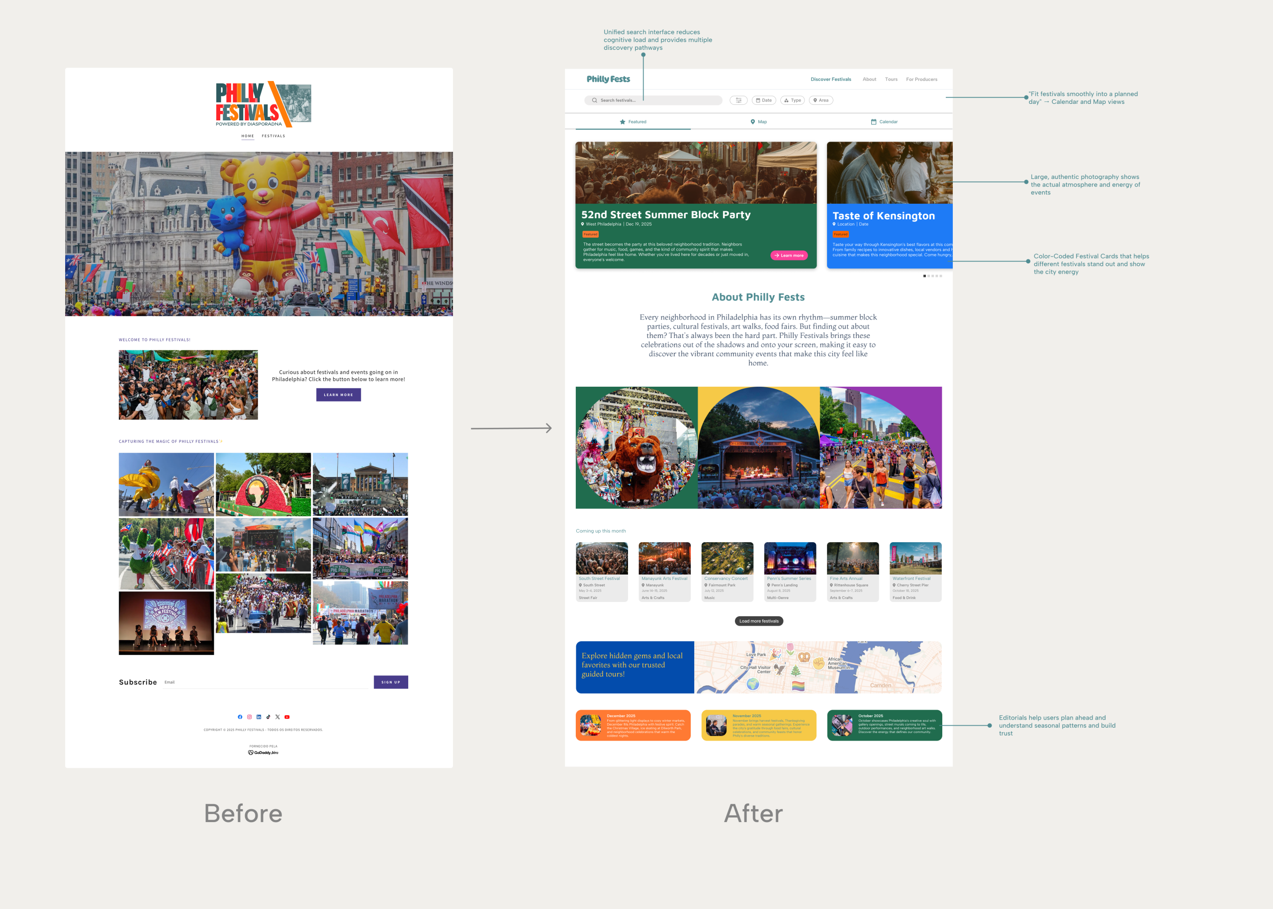 We restructured the information architecture to make festival discovery the core experience, redesigning the homepage as a discovery hub with featured, map, and calendar views. New About, Tours, and Producer pages support Philly Festivals’ cultural mission, future tour plans, and producer needs, while keeping the MVP lightweight and easy to maintain.