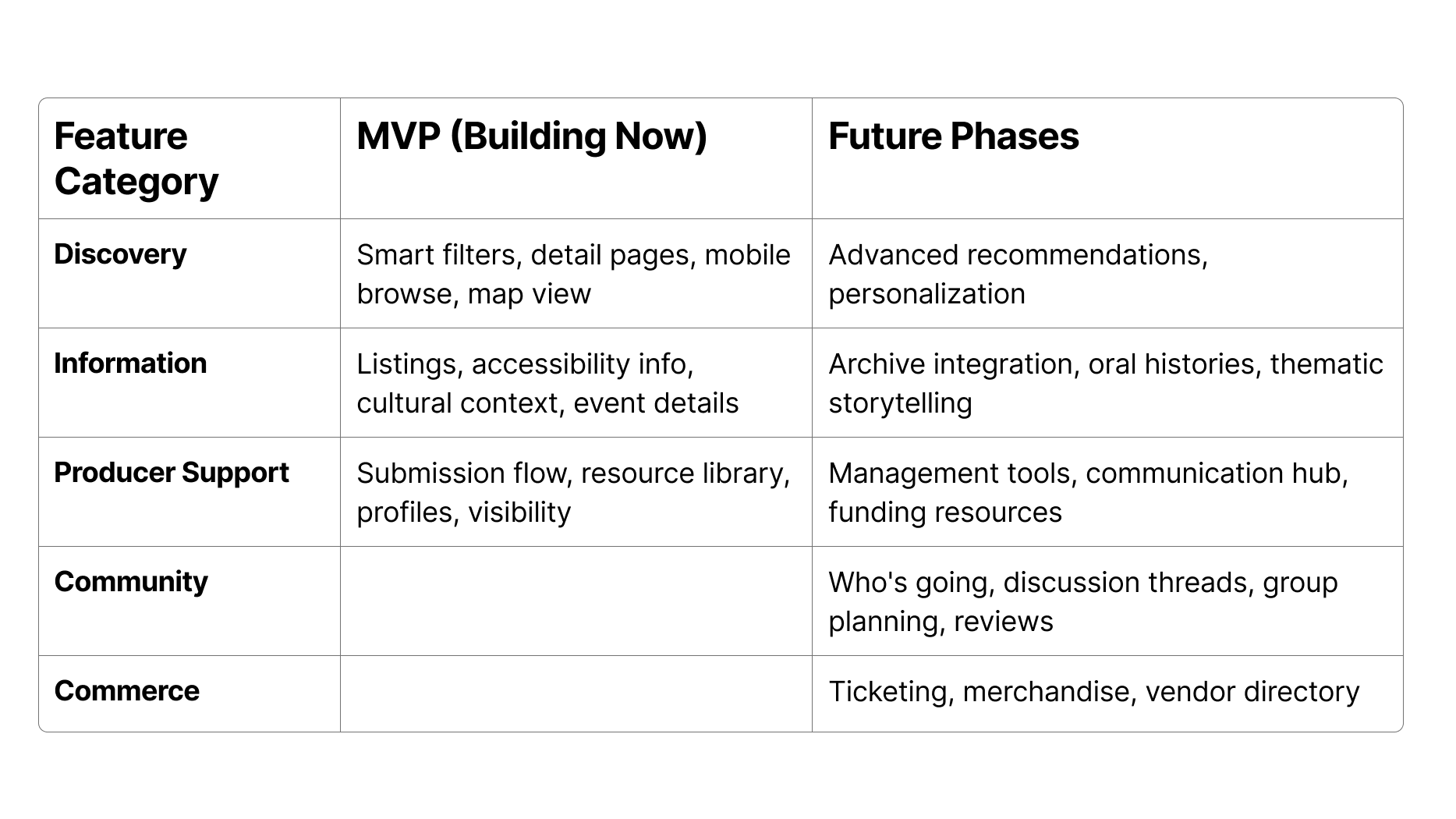 - Funding & Advocacy: Clear access to grants, sponsorships, and resources that help producers secure funding and communicate their cultural and economic impact.