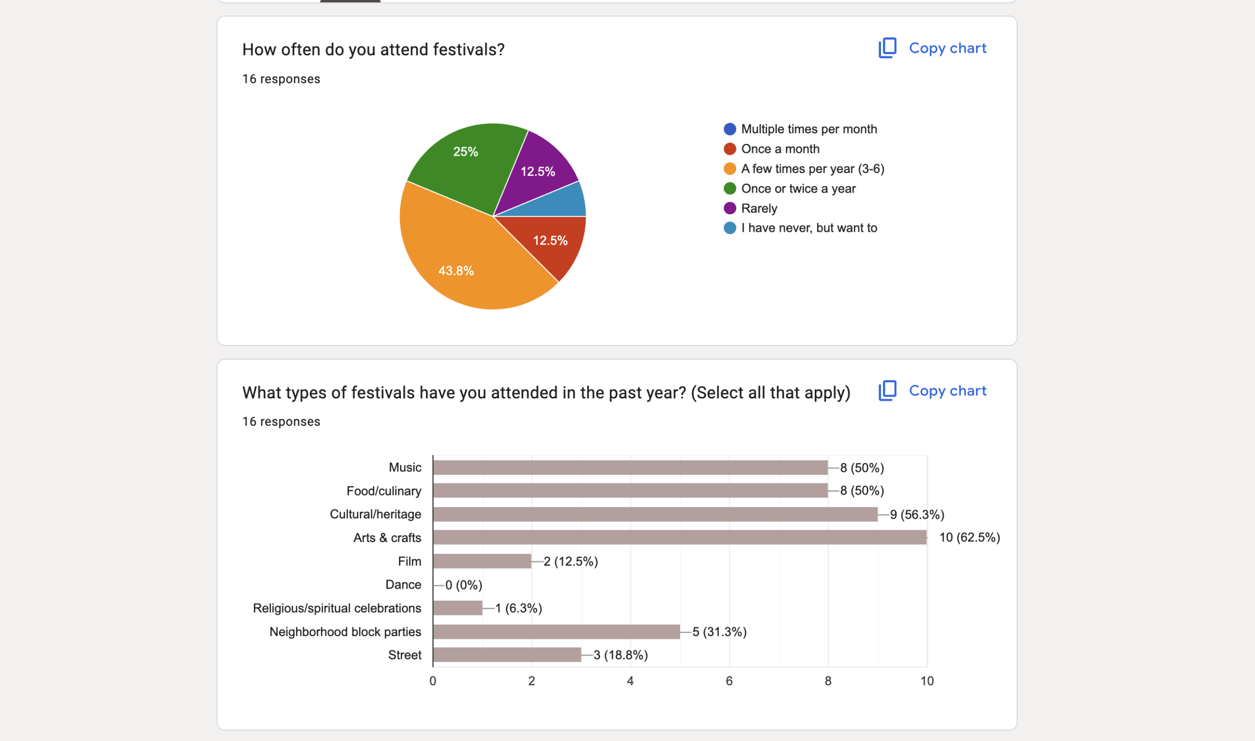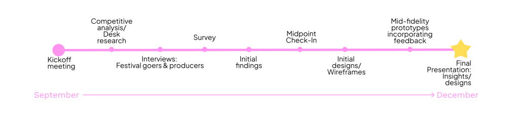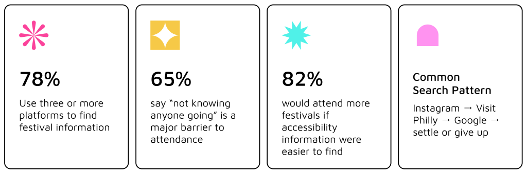Our research focused on understanding how people discover, plan, and experience festivals in Philadelphia, as well as the challenges festival producers face when organizing and promoting these events. We aimed to identify gaps in existing platforms and uncover opportunities to better support both sides of the festival ecosystem.