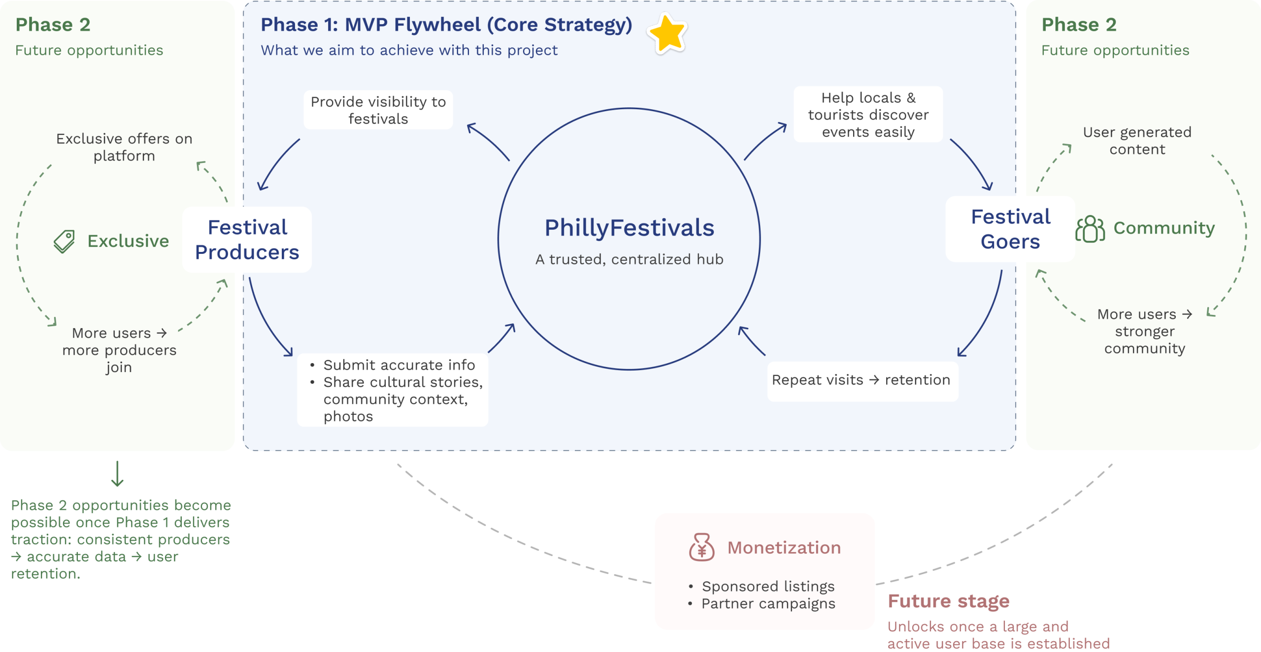 At this stage, Philly Festivals does not yet have the resources to support user profiles, social features, or large-scale moderation. Instead, we focused on a flywheel that builds trust and repeat usage without requiring sign-ins.