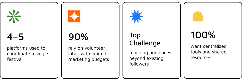 Festival producers juggle fragmented tools, limited resources, and unpredictable promotion channels, making it difficult to reach audiences and tell their stories.