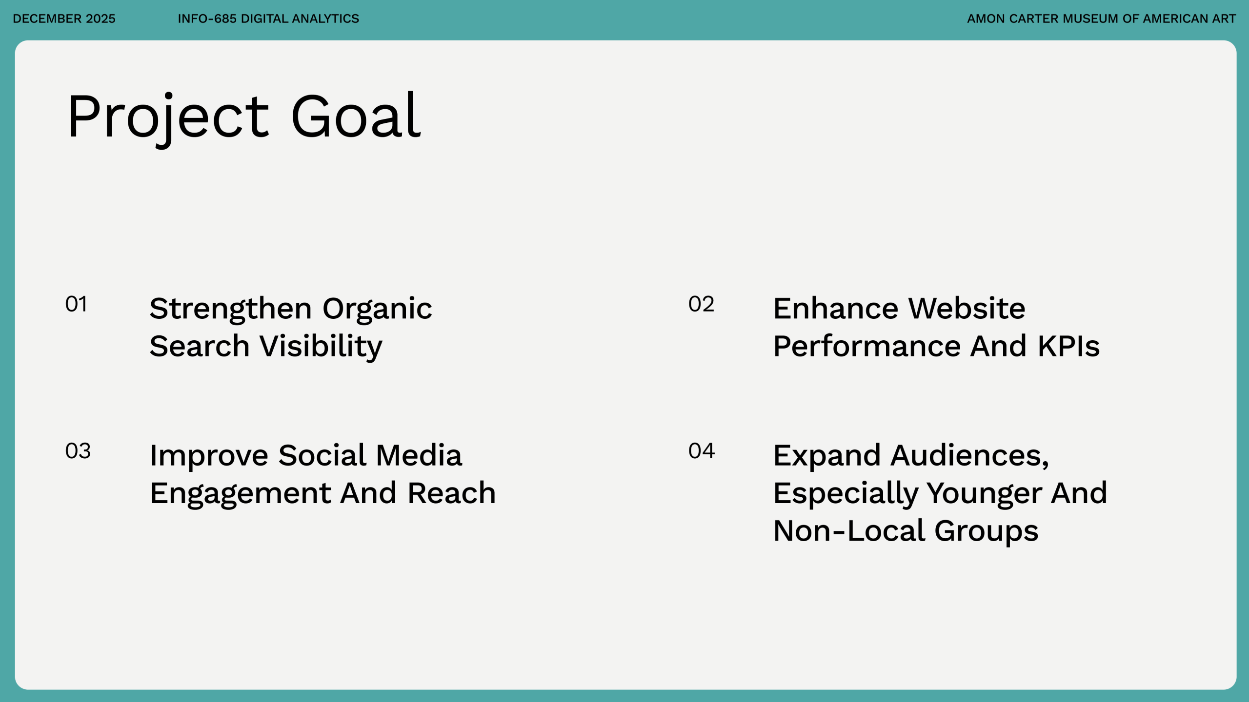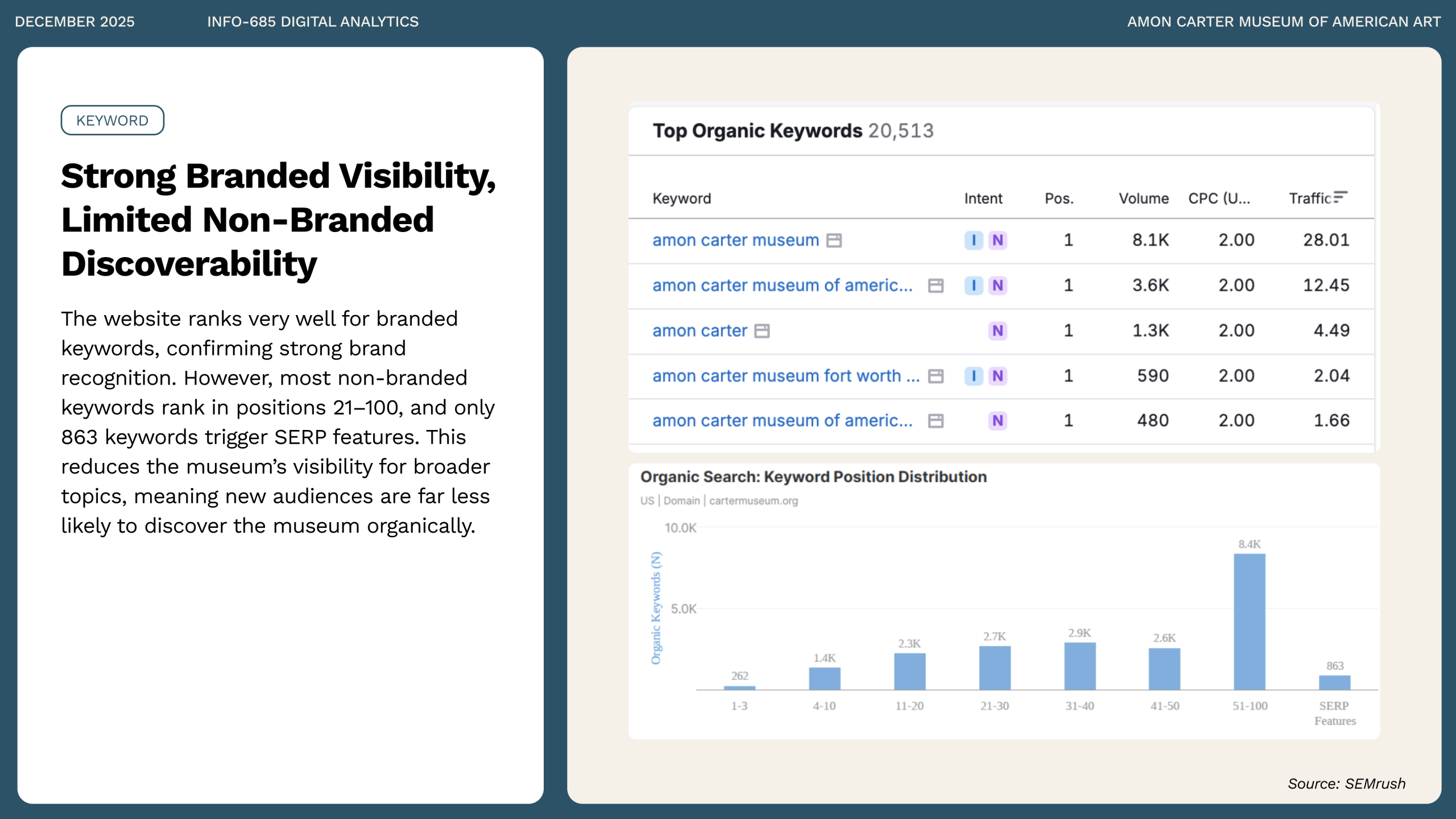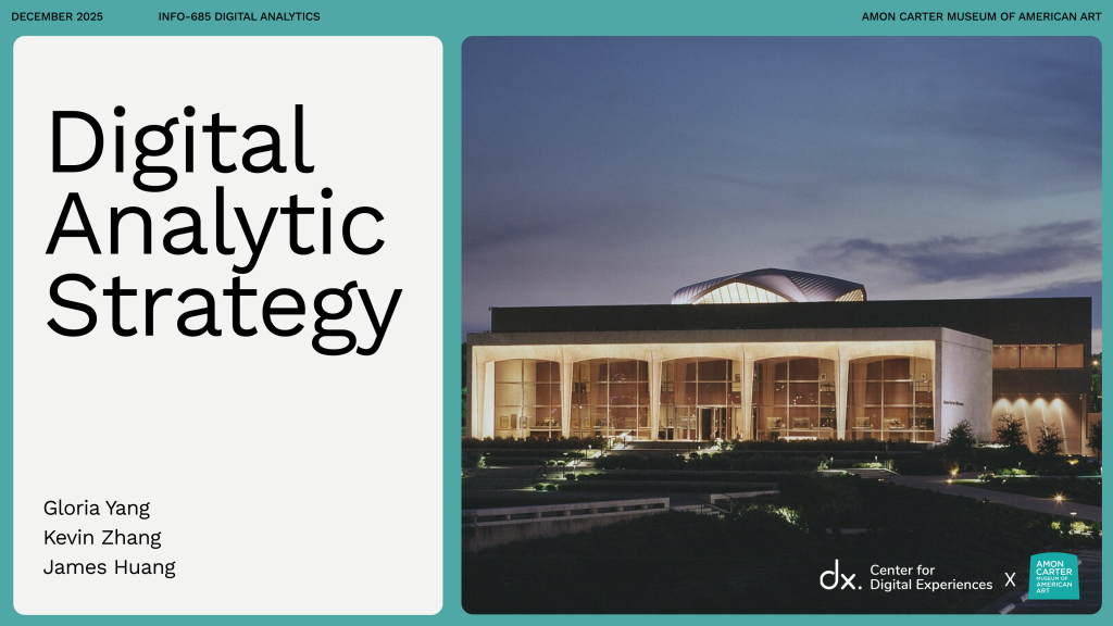 This semester-long project focused on Digital Analytics and Search Engine Optimization (SEO) aimed at optimizing the digital ecosystem for the Amon Carter Museum of American Art. Within a team of three, including Gloria Yang, James Huang, and myself (Kevin Zhang), we conducted a comprehensive audit – ranging from technical SEO analysis to social media engagement metrics – to identify barriers preventing the museum from expanding its audience reach. Based on our findings, we delivered a strategic roadmap to resolve technical performance issues, cleanse corrupted data, and convert passive social engagement into active website traffic.