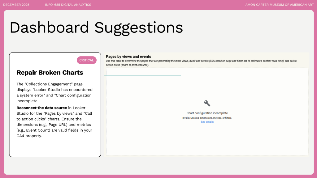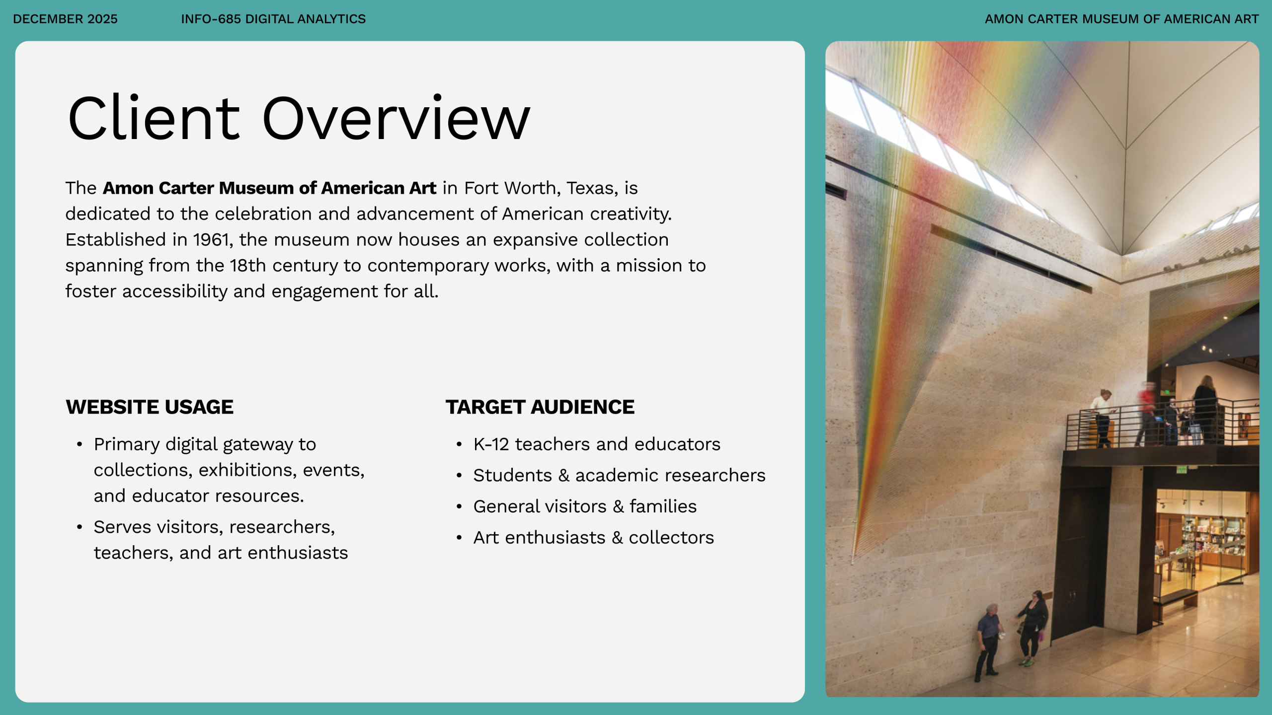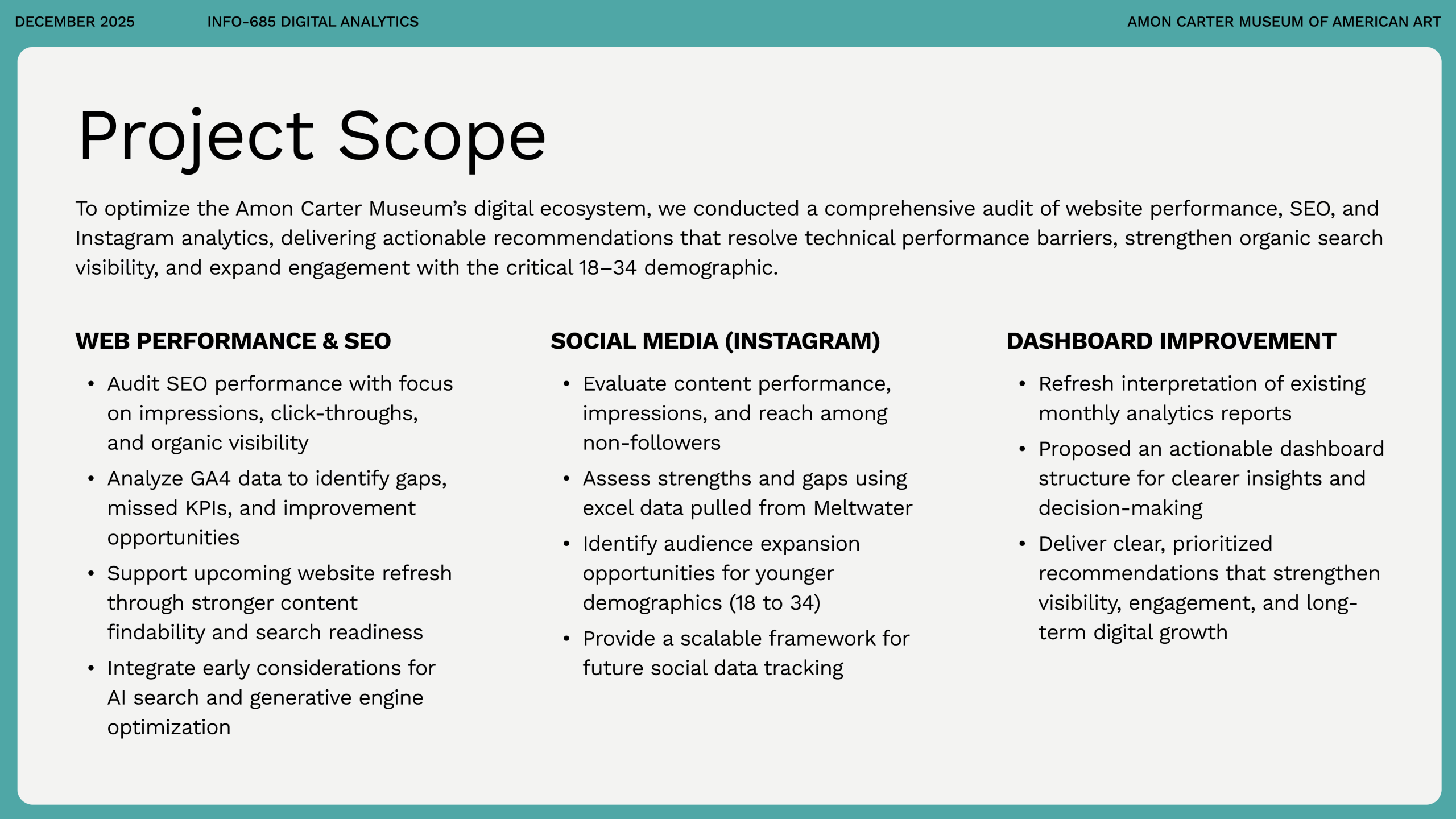 With a background in digital analytics and data integrity, I sought to provide a sustainable, future-proof strategy for the stakeholders at the Amon Carter Museum of American Art. This project offered a valuable opportunity to refine my ability to diagnose complex data discrepancies and translate technical insights into clear business value.