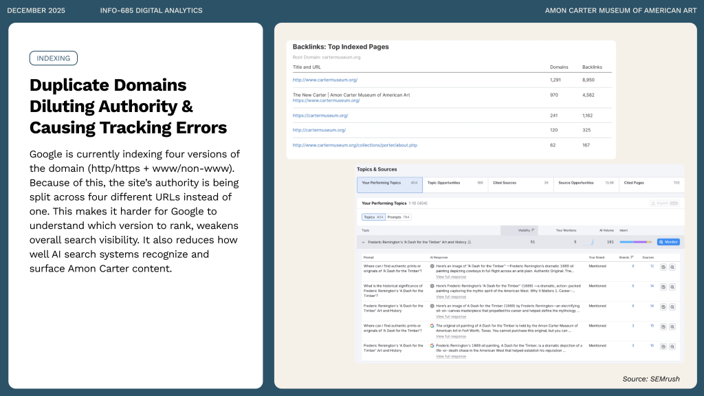 - Consolidation: We proposed an immediate consolidation of all domain variants into a single canonical version to centralize traffic authority and clarify the museum’s digital identity.