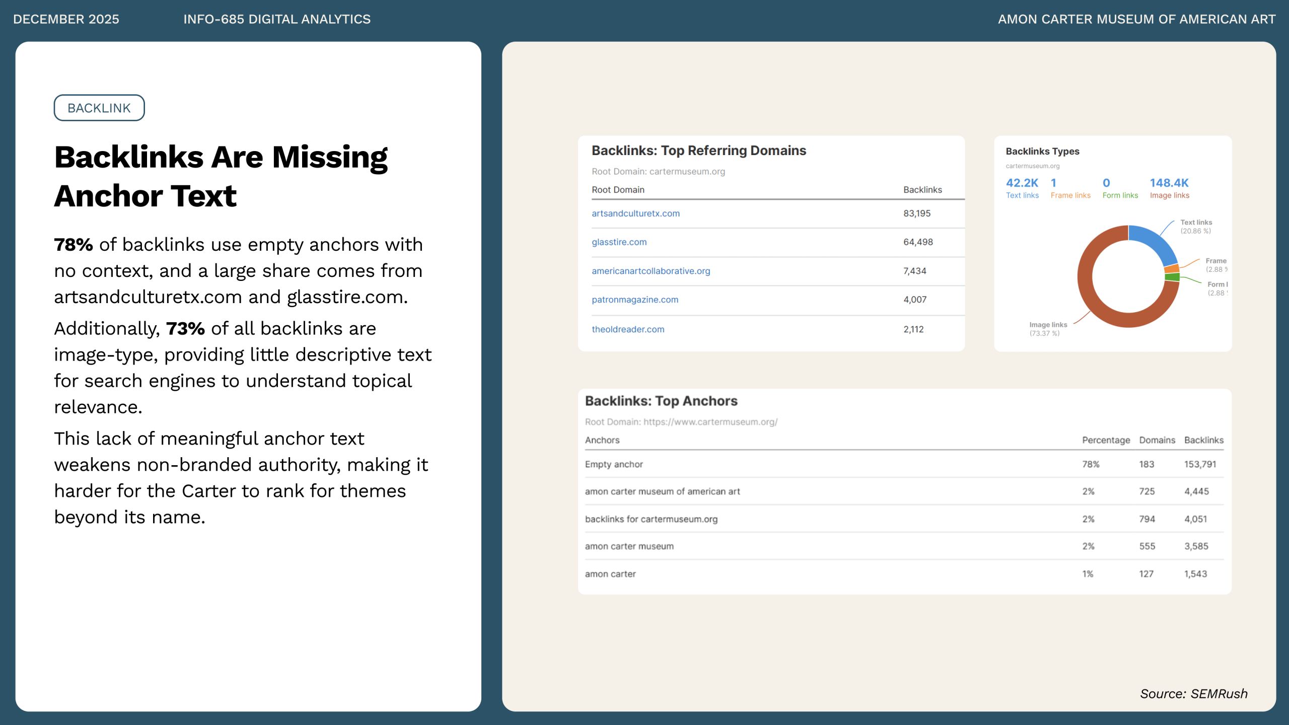 - Descriptive Tagging: We recommended a campaign to replace empty backlinks with descriptive text to finally tell search engines what the Amon Carter is really about (ex. “American Art,” “Fort Worth Exhibitions”) .