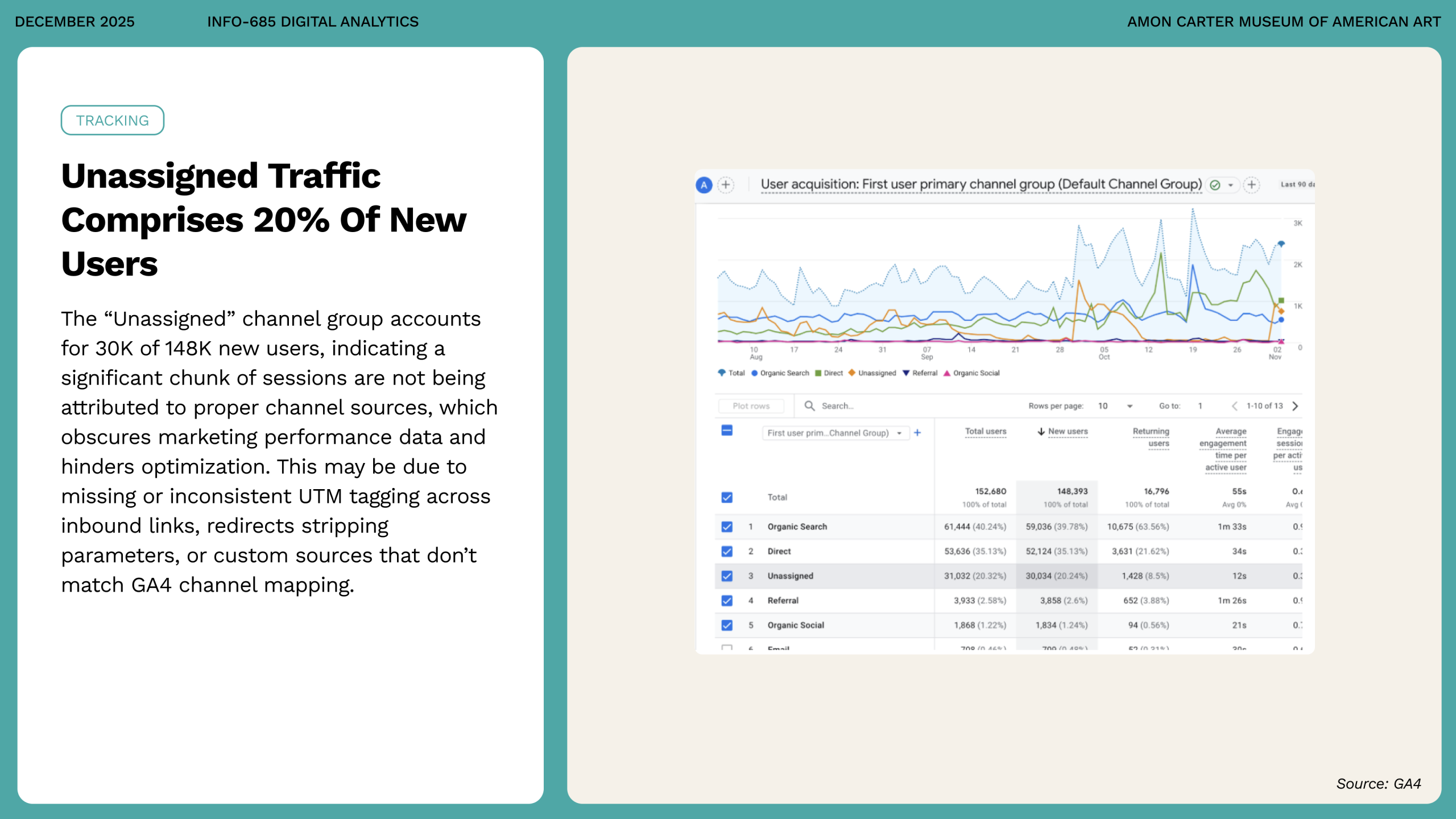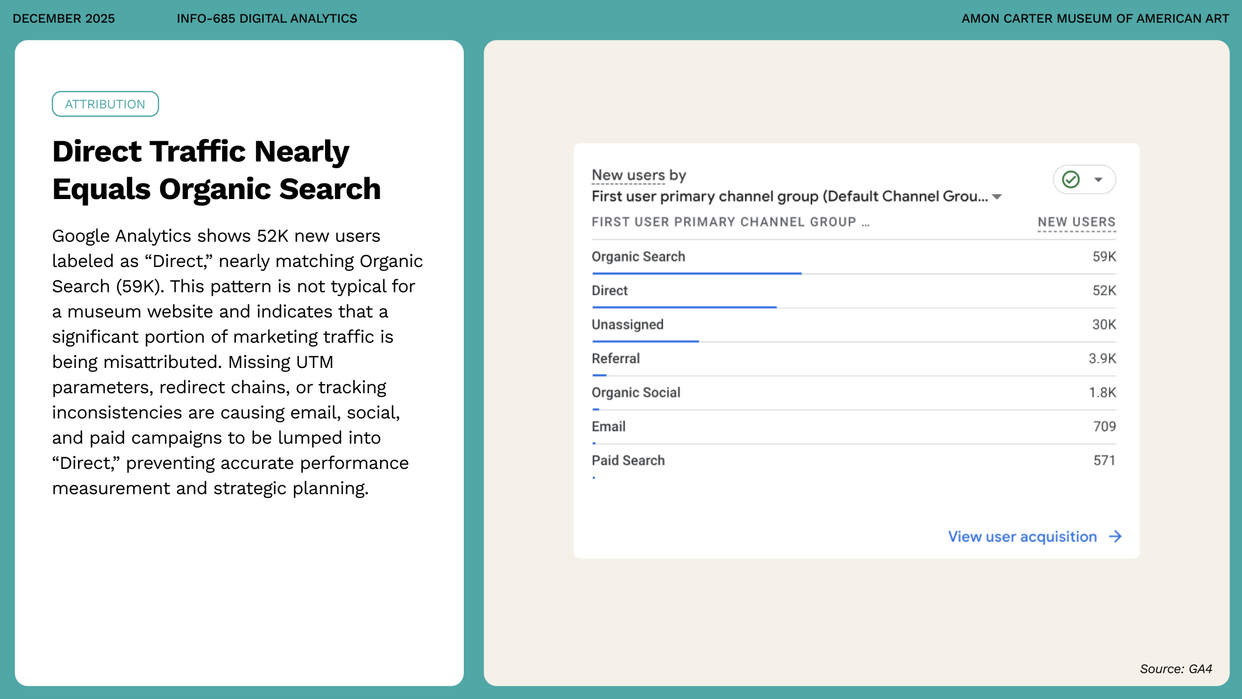 - The Attribution Black Hole: Marketing efforts were vanishing. We found that 52,000 users were listed as “Direct” traffic, nearly matching Organic Search, because email and social campaigns lacked proper tracking tags (UTMs) . The museum was flying blind on campaign performance.