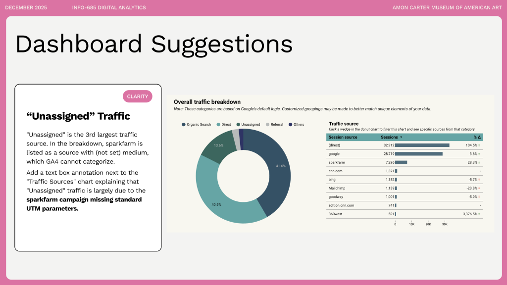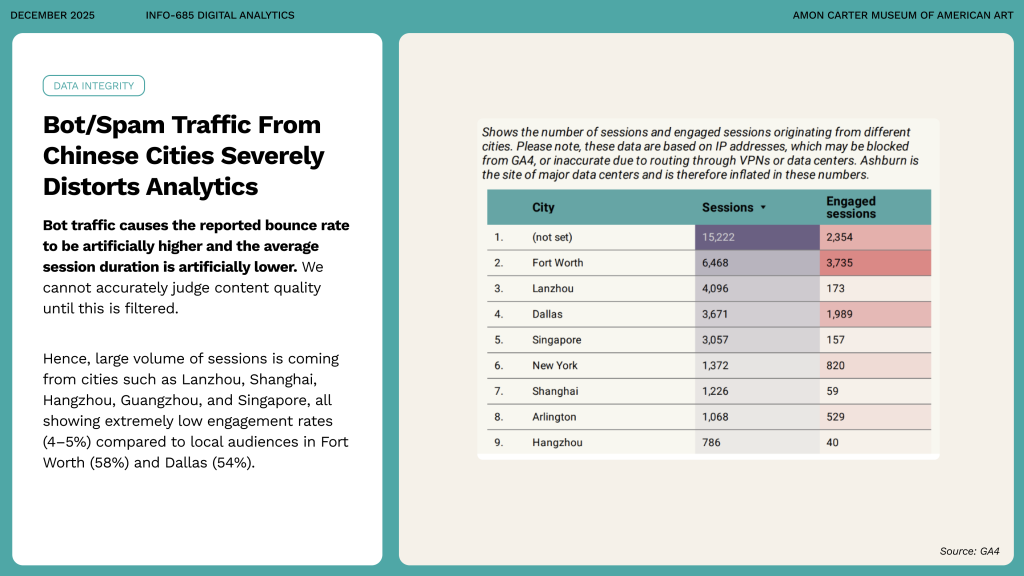 In our collaborative effort to assess the museum’s multi-faceted digital ecosystem, I took a lead role in facilitating stakeholder communication and establishing the analytical framework for the audit. My primary focus was on data analysis, where I identified significant traffic anomalies and attribution gaps that were skewing performance metrics. In addition, I also took it upon myself to create data visualizations for our insights. Beyond the technical audit, I contributed to the social media analysis to evaluate engagement patterns and identify audience growth opportunities. Finally, I was responsible for structuring the framework of our final project presentation, synthesizing our diverse technical findings into a cohesive narrative for the client.