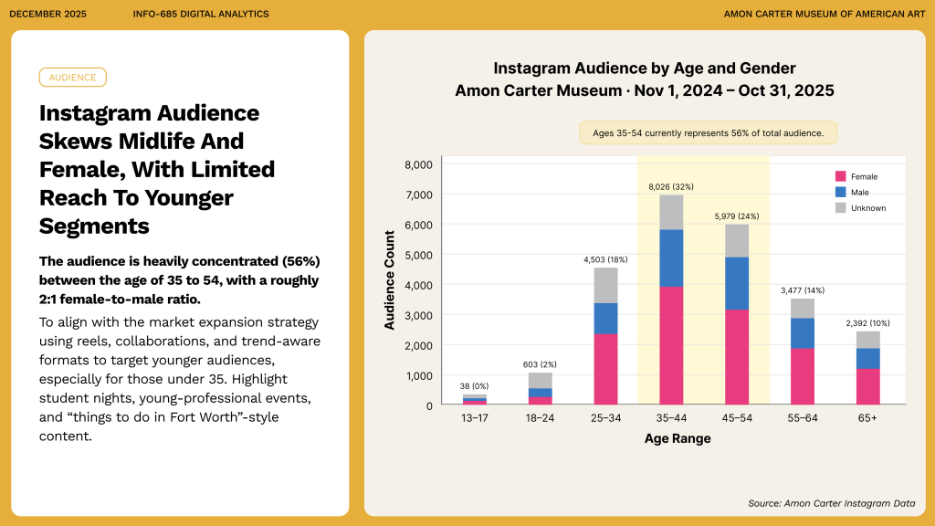 We began by meeting with the client team, Michelle and Collections Manager Clara, to secure analytics access and align on KPIs. The initiative aims to modernize the museum’s digital strategy with a 50/50 split focus on website SEO optimization and social media performance, specifically prioritizing Instagram while dropping Facebook due to data quality issues. A critical strategic imperative identified is the expansion of the museum’s audience into the 18-34 demographic to build a future donor pipeline, as the traditional core audience (60+) is aging out.