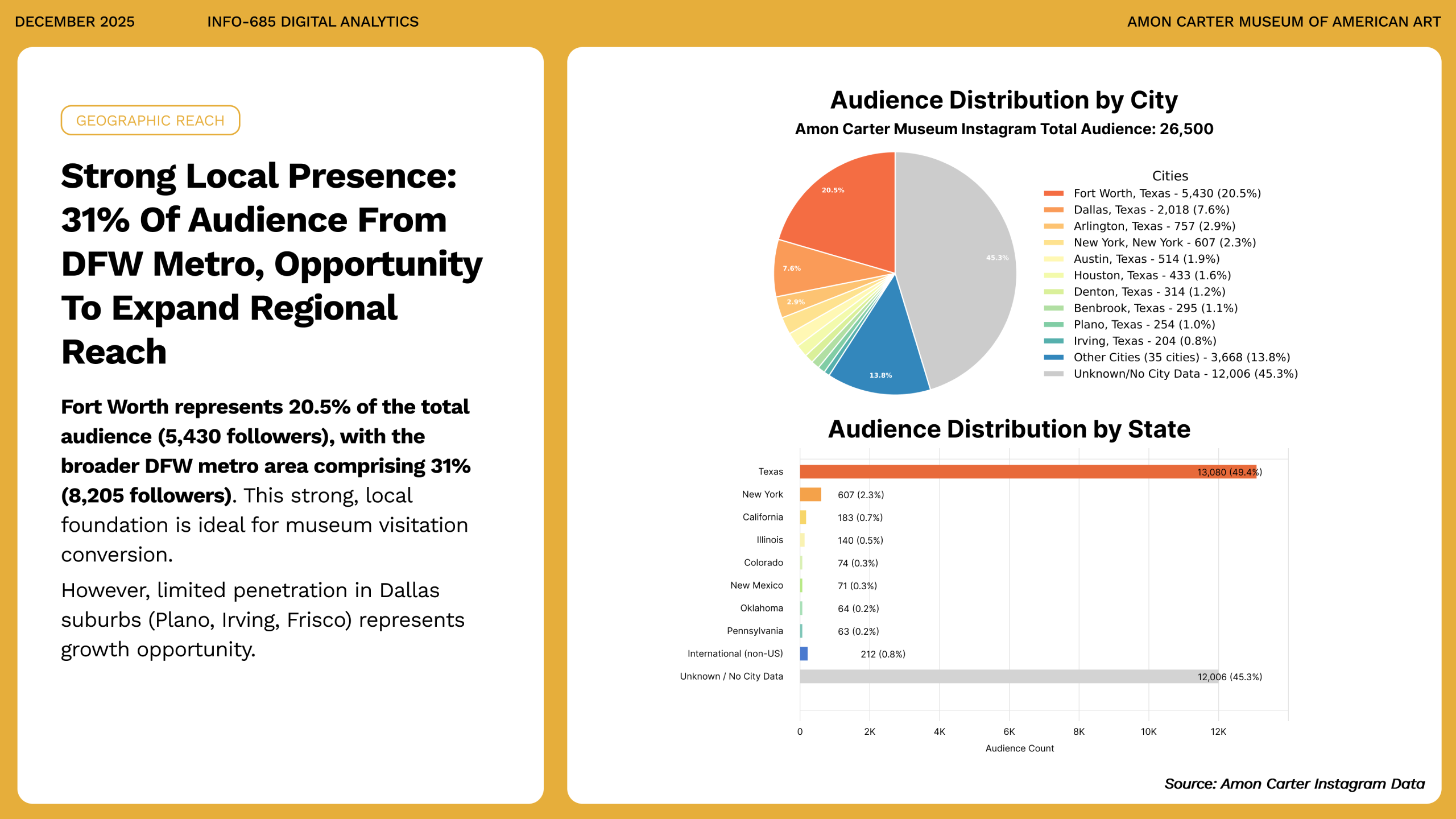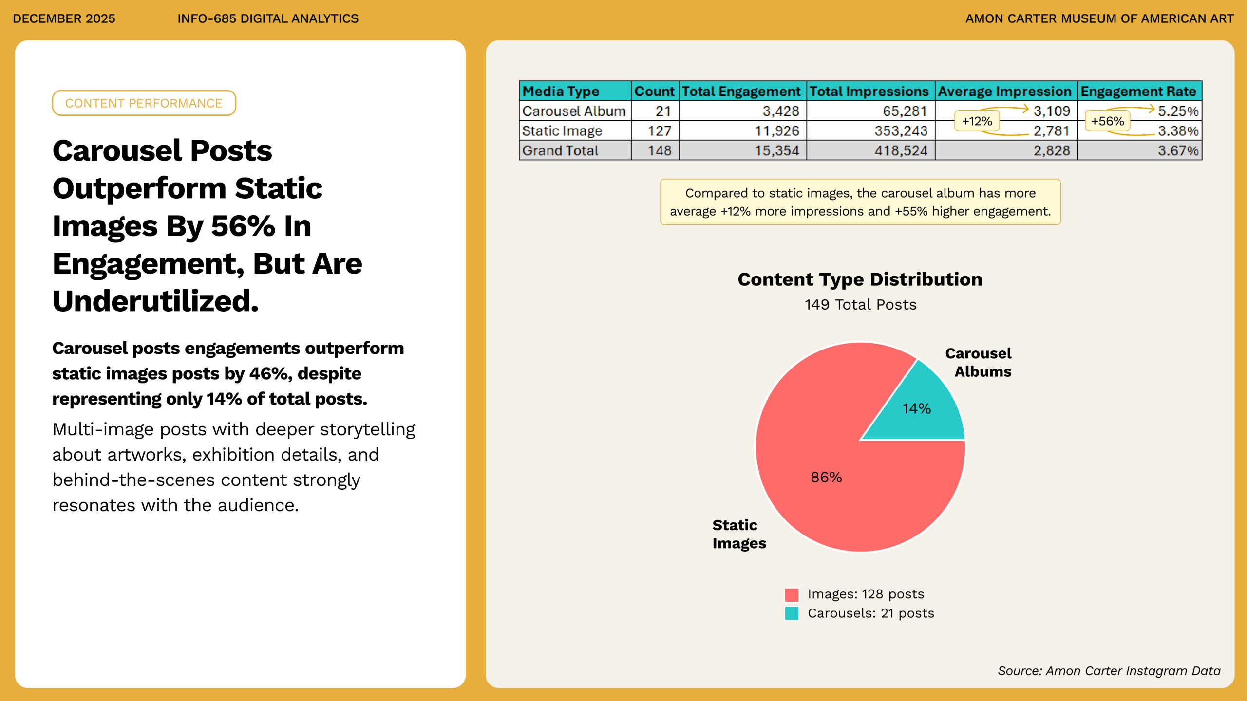 - The Competitor Contrast: Our analysis of neighbors like The Modern Art Museum of Fort Worth revealed a stark reality: personality drives performance. While the Carter posts static graphic while competitors would include reels that featured curators discussing exhibitions, content that consistently topped engagement charts with over 10k views. Data backs that that audiences convert on human connection rather than just information.