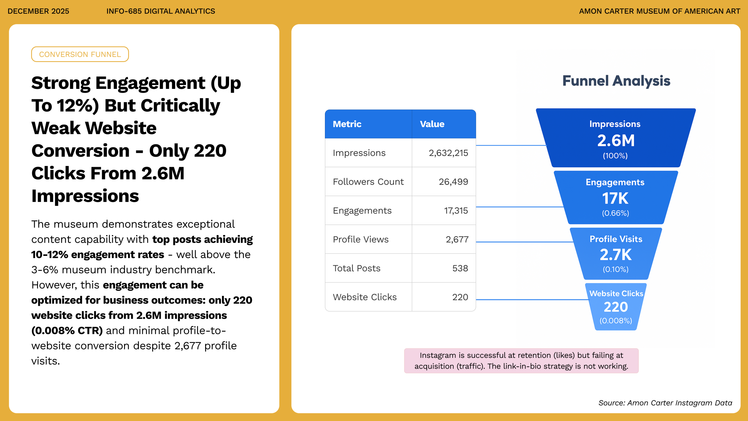 - The “Flyer” Effect: The museum was treating Instagram like a digital bulletin board, posting static images of event flyers. The best posts garnered high engagement rates (10-12%), the click-through rate to the website was a negligible 0.008% . Users were liking, but they weren’t leaving the app to buy tickets.