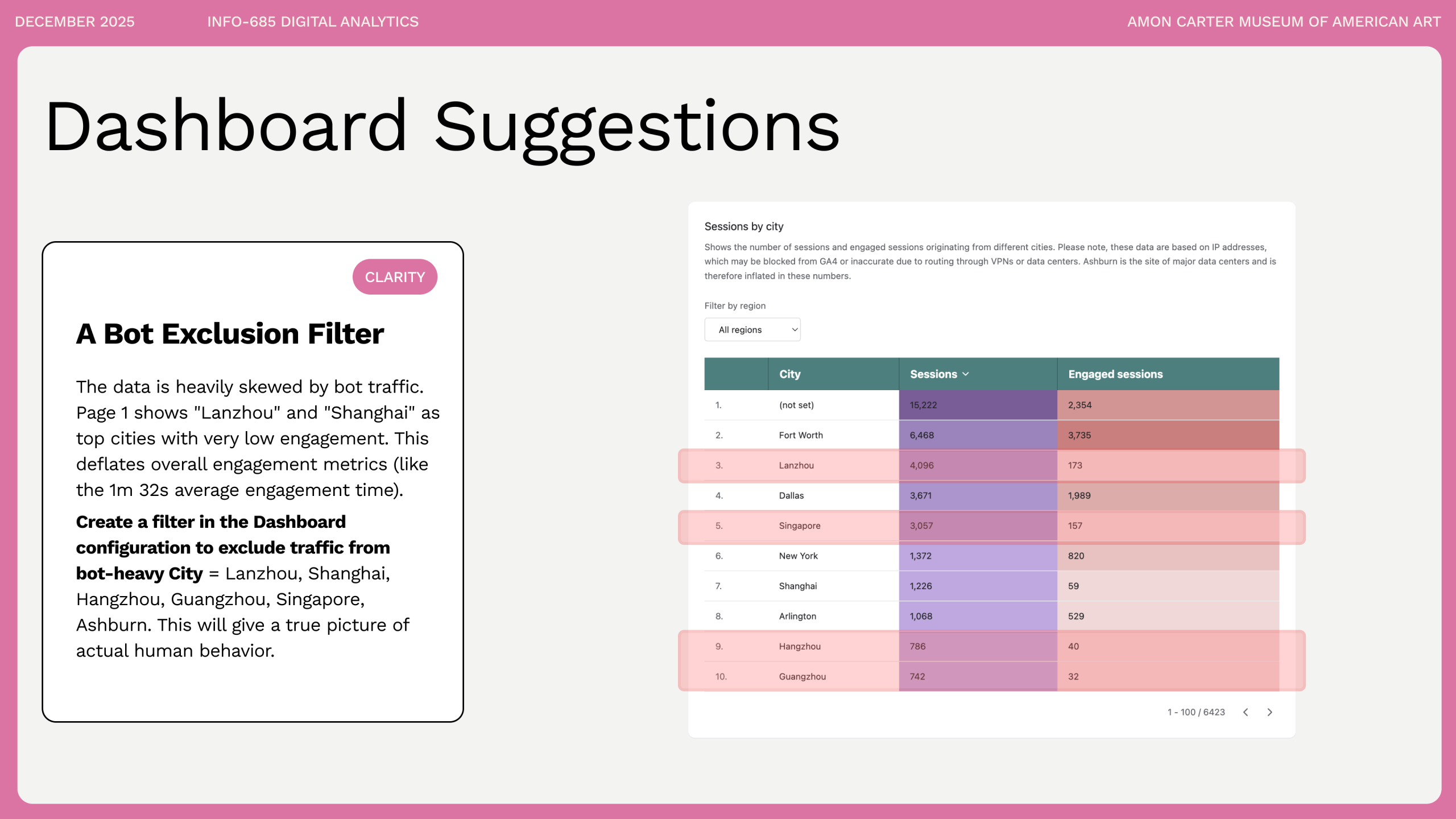 - Dashboard Optimization: We advised repairing broken data connectors to restore visibility on collection engagement , adding explanatory annotations for “Unassigned” traffic sources to clarify reporting for stakeholders , and applying bot-exclusion filters (based on geography) directly to dashboard views to ensure ongoing reports reflect genuine human behavior.