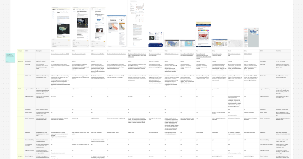 Through the design exploration process, we focused on features that would support the types of users we interviewed. We identified the map filters, site overview, data report access, and accessibility features as prime candidates for redesigning in order to improve clarity and accessibility. We also decided to add onboarding user guides and additional collaboration features in order to give users the tools needed to be effective in their roles preparing and conducting the Census.