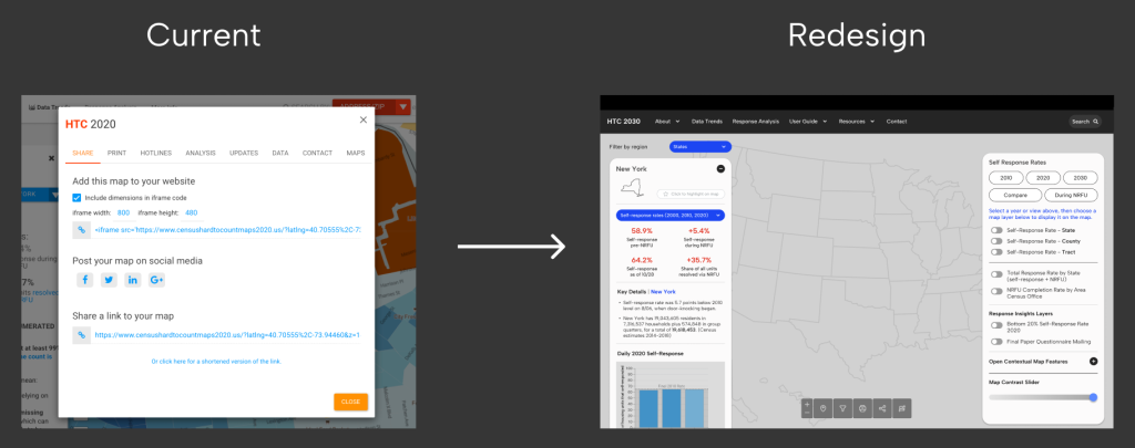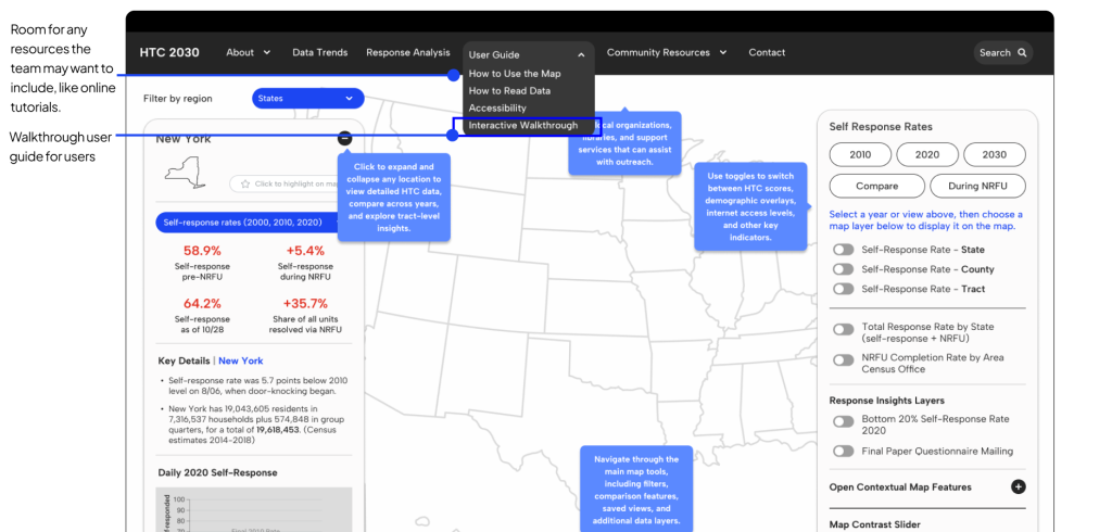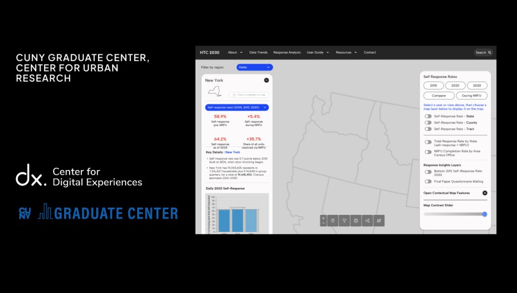 In preparation for the 2030 Census, the Center for Urban Research at the CUNY Graduate Center wanted to redesign the front-end application interface for the initial version of the 2030 Hard to Count (HTC) Map, a resource that will be used to support nationwide stakeholders in their efforts to ensure an accurate and fair Census count.