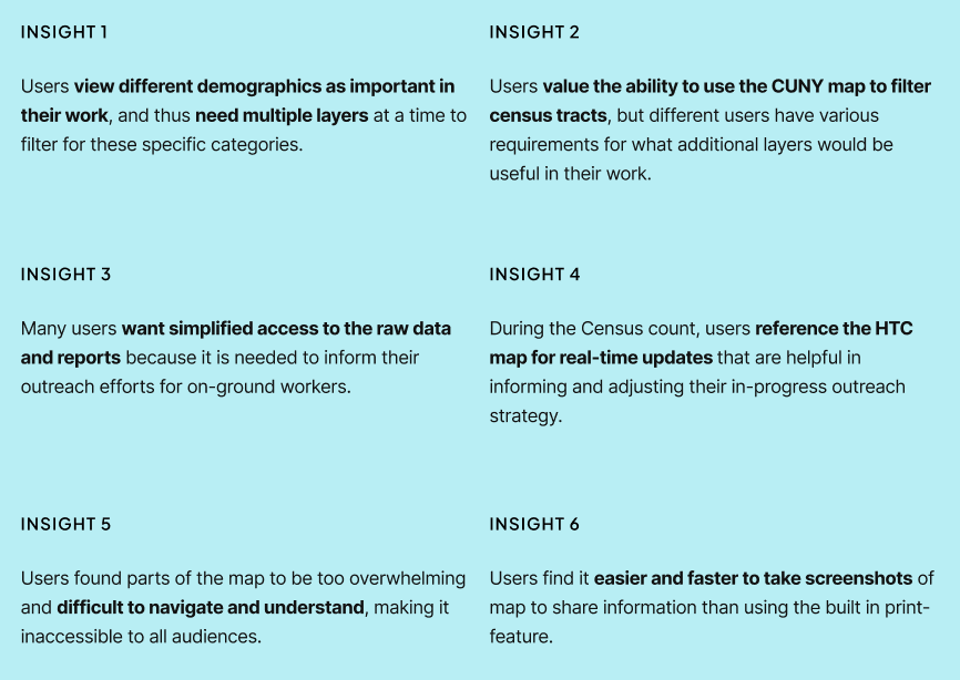 Through conducting interviews with ten stakeholders from organizations with experience using the CUNY HTC 2020 map, we uncovered user’s specific needs, pain points, and thoughts about the current state of the CUNY HTC 2020 Census map.