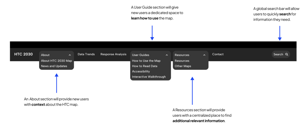 - What features, visualizations, or interactions do other organizations use in their maps that would make the 2030 HTC map more understandable and actionable for diverse audiences?