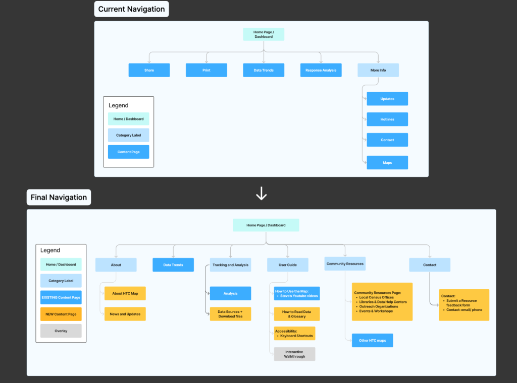 After: Our recommendations include a more structured list of drop down items in the main navigation that organize supporting content for the map and also provide context for why the map is an important resource for organizations invested in the success of the U.S. Census.