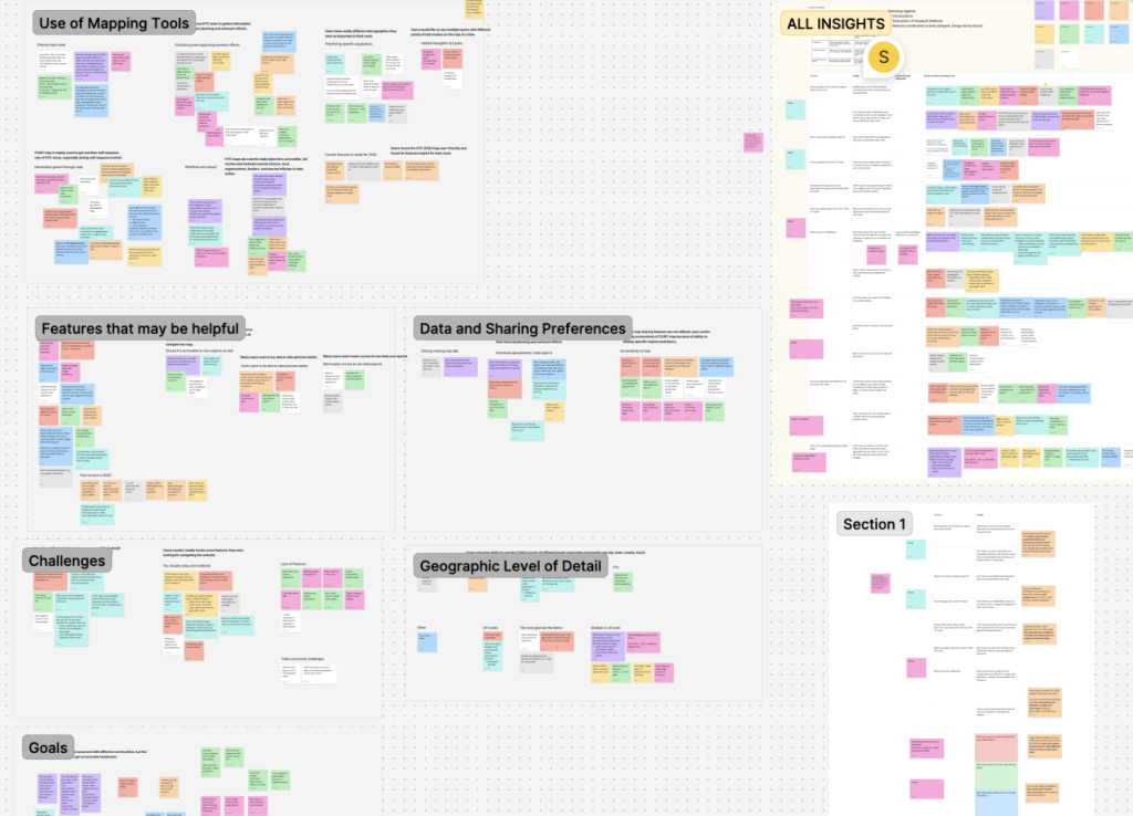However, with so many kinds of users that have different goals in using the map, there were an overwhelming number of directions we could take our design in. To determine priorities with user needs and challenges, we scheduled an affinity mapping and MoSCoW prioritization workshop with the client and identified 6 main findings characterizing how users interact with the interface.