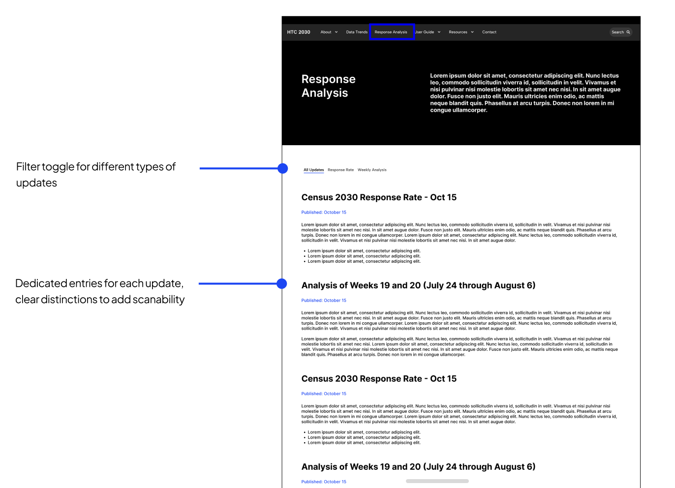 Through the design exploration process, we focused on features that would support the types of users we interviewed. We identified the map filters, site overview, data report access, and accessibility features as prime candidates for redesigning in order to improve clarity and accessibility. We also decided to add onboarding user guides and additional collaboration features in order to give users the tools needed to be effective in their roles preparing and conducting the Census.