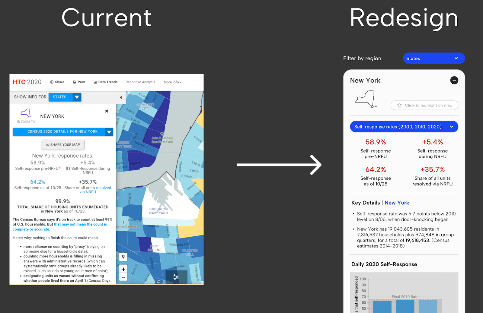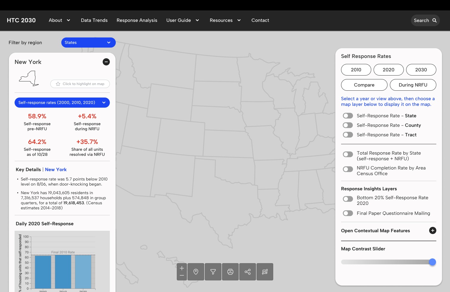In preparation for the 2030 Census, the Center for Urban Research at the CUNY Graduate Center wanted to redesign the front-end application interface for the initial version of the 2030 Hard to Count (HTC) Map, a resource that will be used to support nationwide stakeholders in their efforts to ensure an accurate and fair Census count.