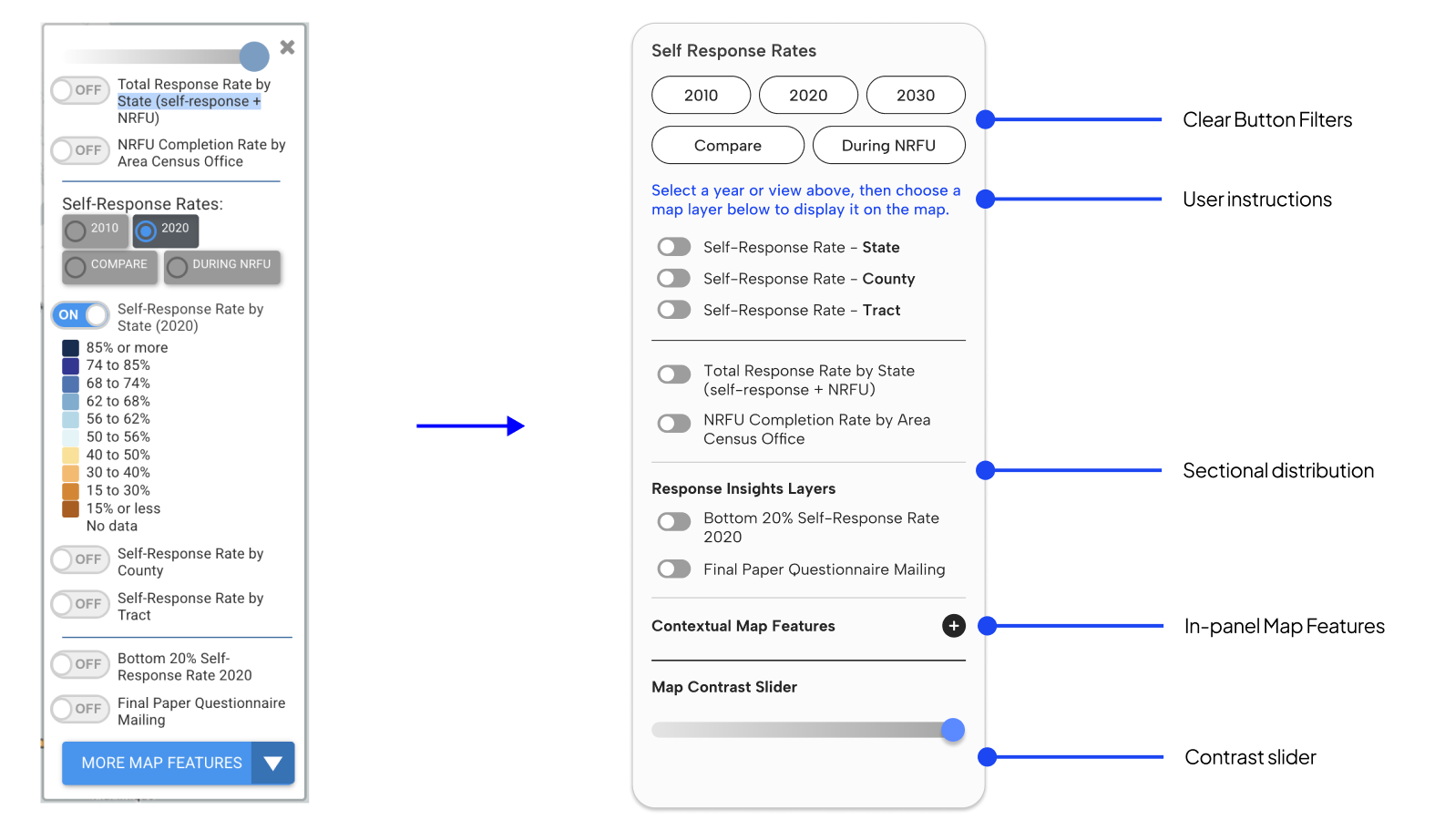 After: In order to create a more cohesive experience, we recommend focusing the right dashboard panel to enable a more dynamic and intuitive view for layer selection. Our design establishes a consistent, structured layout that organizes all map layers by category, including layers that toggle on and off relative to one another with switch controls and overlays that use radio buttons to tell users which layers are active.