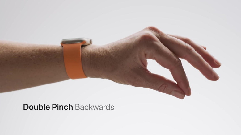 The pinch and double pinch gestures allow users to move through and confirm selections without touching the screen. A single pinch typically moves the selection focus forward within a scanning interface, while a double pinch confirms or activates the highlighted option. Instead of requiring precise tapping on a small display