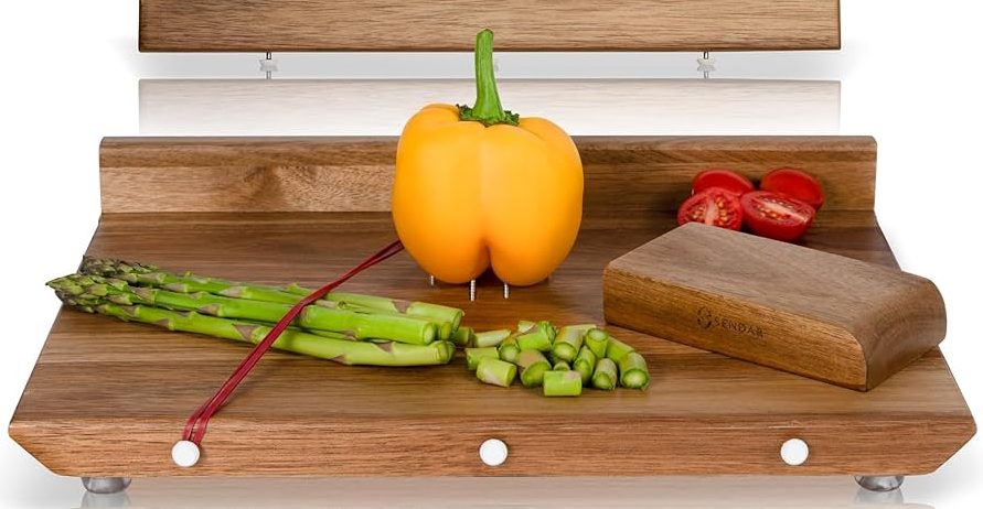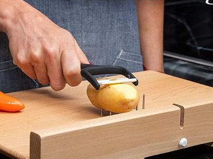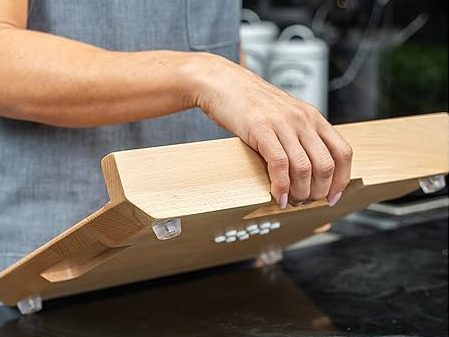 Under the board, there are finger recesses designed to make it easier to grip. By hooking their fingers under the grooves, users can lift and move the board around the kitchen using only one hand.