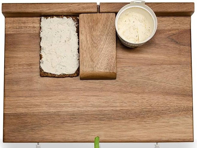 There is a raised L-shaped corner buffer on the board, also known as a guard rail, which provides a physical stop for ingredients. In this way, the user can push food into the corner to ensure stability while spreading butter or jam.