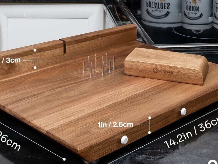 Ten stainless steel spikes are located in the center of the board. The spikes are designed to hold ingredients in place, especially whole foods like potatoes or apples. This stabilization makes it easier to peel or chop food without slipping.